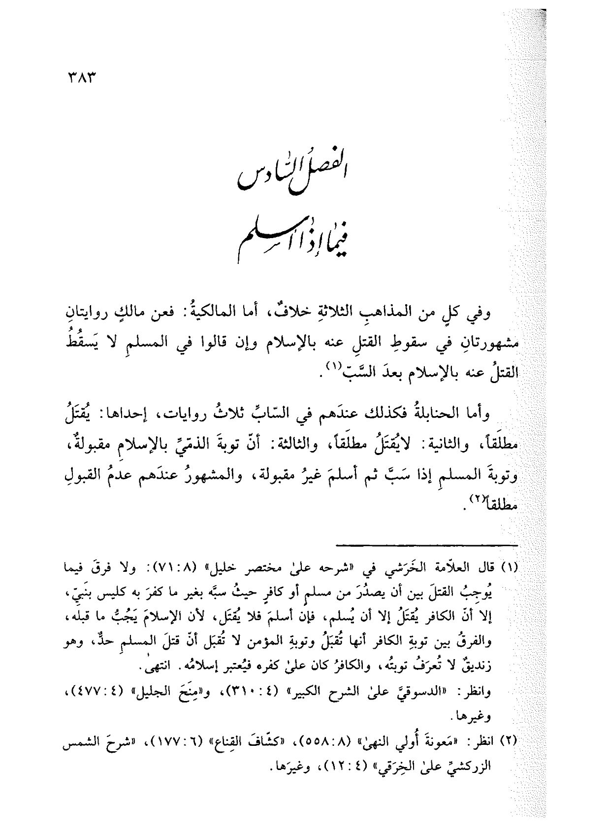 وفي كل من المذاهب الثلاثة خلاف، أما المالكية: فعن مالك روايتان مشهورتان في سقوط القتل عنه بالإسلام وإن قالوا في المسلم لا يسقط القتل عنه بالإسلام بعد السب.