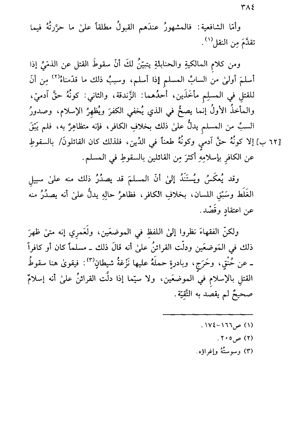 ولكن الفقهاء نظروا إلى اللفظ في الموضعين، ولعمري إنه متى ظهر ذلك في الموضعين ودلت القرائن على أنه قال ذلك ـ مسلمًا كان أو كافرًا ـ عن حنق، وحرج، وبادرة حمله عليها نزغة شيطان: فيقوى هنا سقوط القتل بالإسلام في الموضعين، ولا سيما إذا دلت القرائن على أنه إسلام صحيح لم يقصد به التقية.