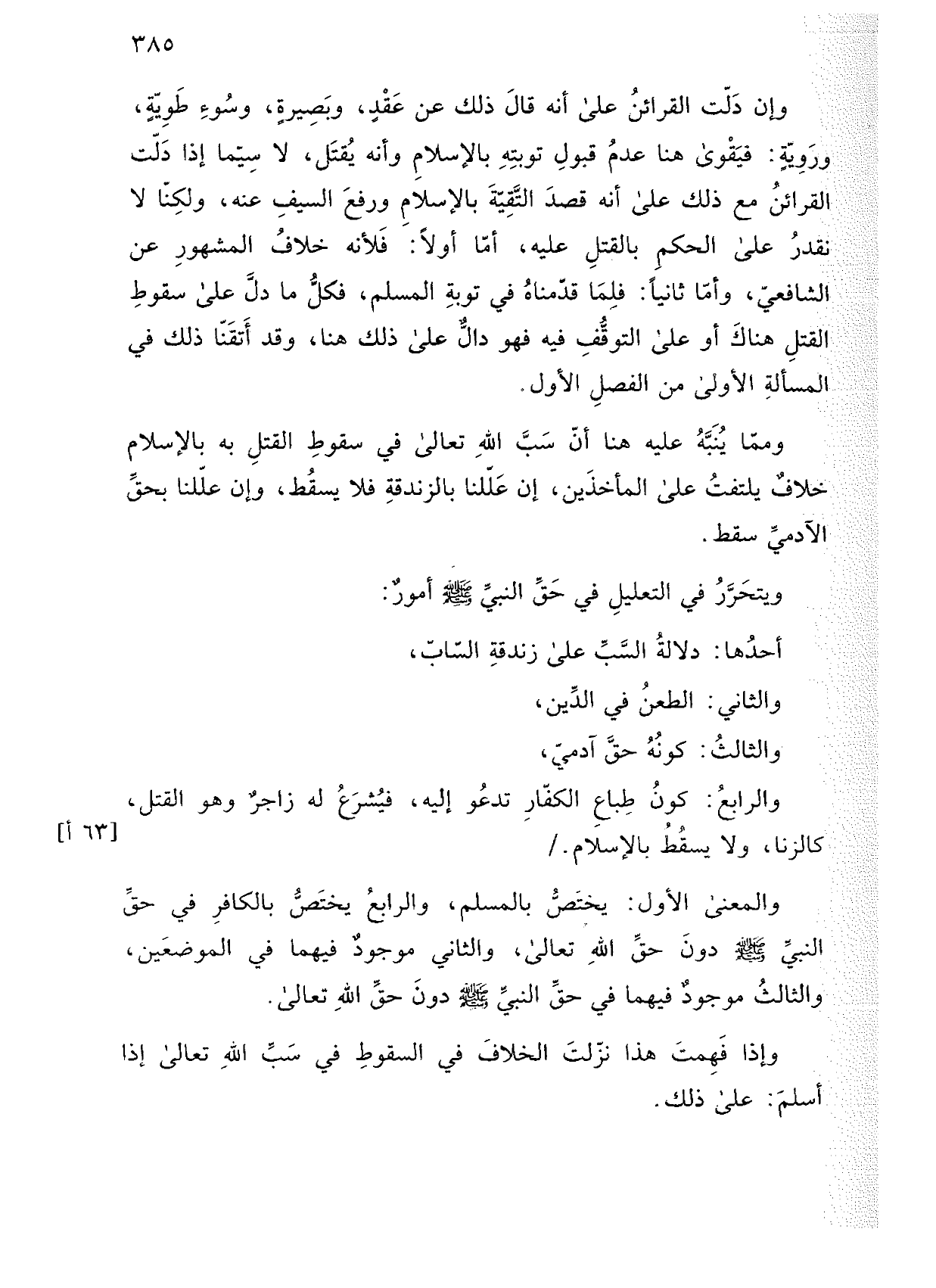 وإن دلت القرائن على أنه قال ذلك عن عقدٍ، وبصيرة، وسوء طوية، وروية: فيقوى هنا عدم قبول توبته بالإسلام وأنه يقتل، لا سيما إذا دلت القرائن مع ذلك على أنه قصد التقية بالإسلام ورفع السيف عنه، ولكنا لا نقدر على الحكم بالقتل عليه، أما أولا: فلأنه خلاف المشهور عن الشافعي، وأما ثانيًا: فلما قدمناه في توبة المسلم، فكل ما دل على سقوط القتل هناك أو على التوقف فيه فهو دال على ذلك هنا، وقد أتقنا ذلك في المسألة الأولى من الفصل الأول.