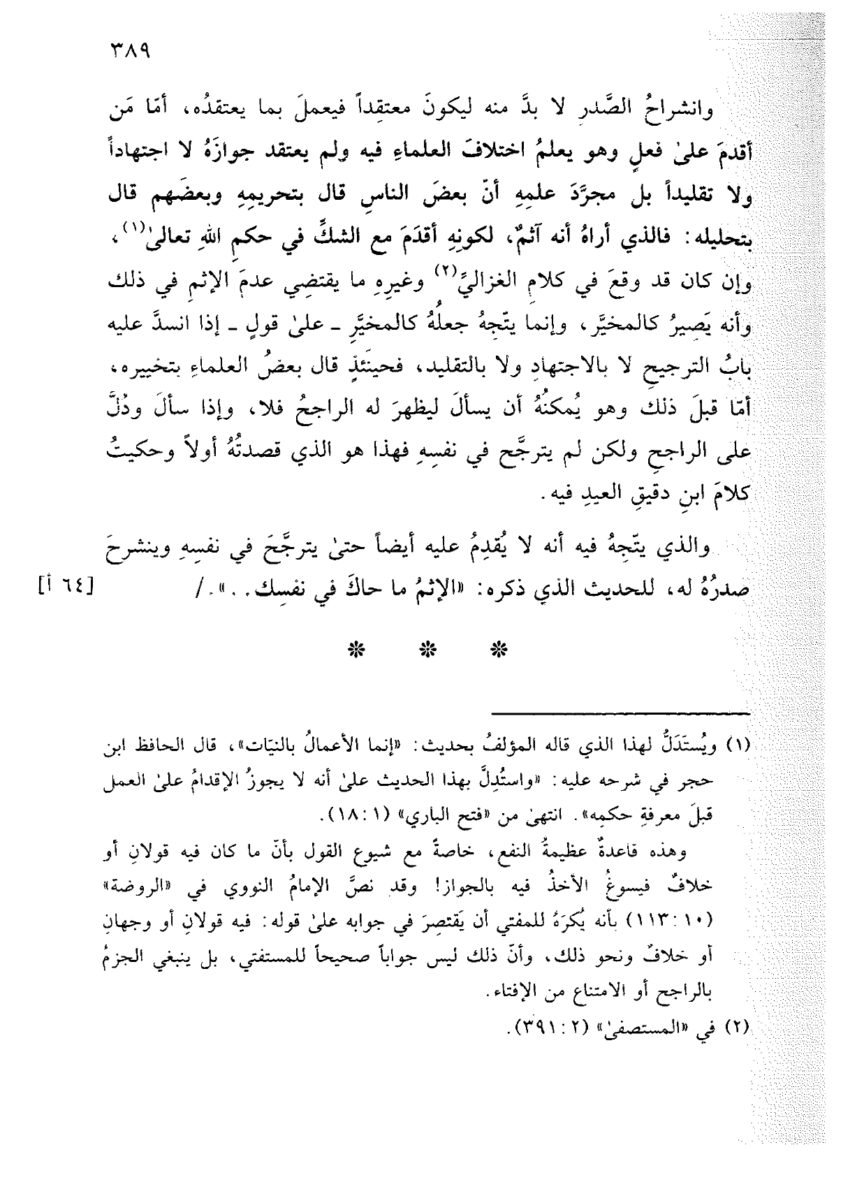 وانشراح الصدر لا بد منه ليكون معتقدًا فيعمل بما يعتقده، أما من أقدم على فعل وهو يعلم اختلاف العلماء فيه ولم يعتقد جوازه لا اجتهادًا ولا تقليدًا بل مجرد علمه أن بعض الناس قال بتحريمه وبعضهم قال بتحليله: فالذي أراه أنه آثم، لكونه أقدم مع الشك في حكم الله تعالى، وإن كان قد وقع في كلام الغزالي وغيره ما يقتضي عدم الإثم في ذلك وأنه يصير كالمخير، وإنما يتجه جعله كالمخير ـ على قول ـ إذا انسد عليه باب الترجيح لا بالاجتهاد ولا بالتقليد، فحينئذ قال بعض العلماء بتخييره، أما قبل ذلك وهو يمكنه أن يسأل ليظهر له الراجح فلا، وإذا سأل ودل على الراجح ولكن لم يترجح في نفسه فهذا هو الذي قصدته أولاً وحكيت كلام ابن دقيق العيد فيه.