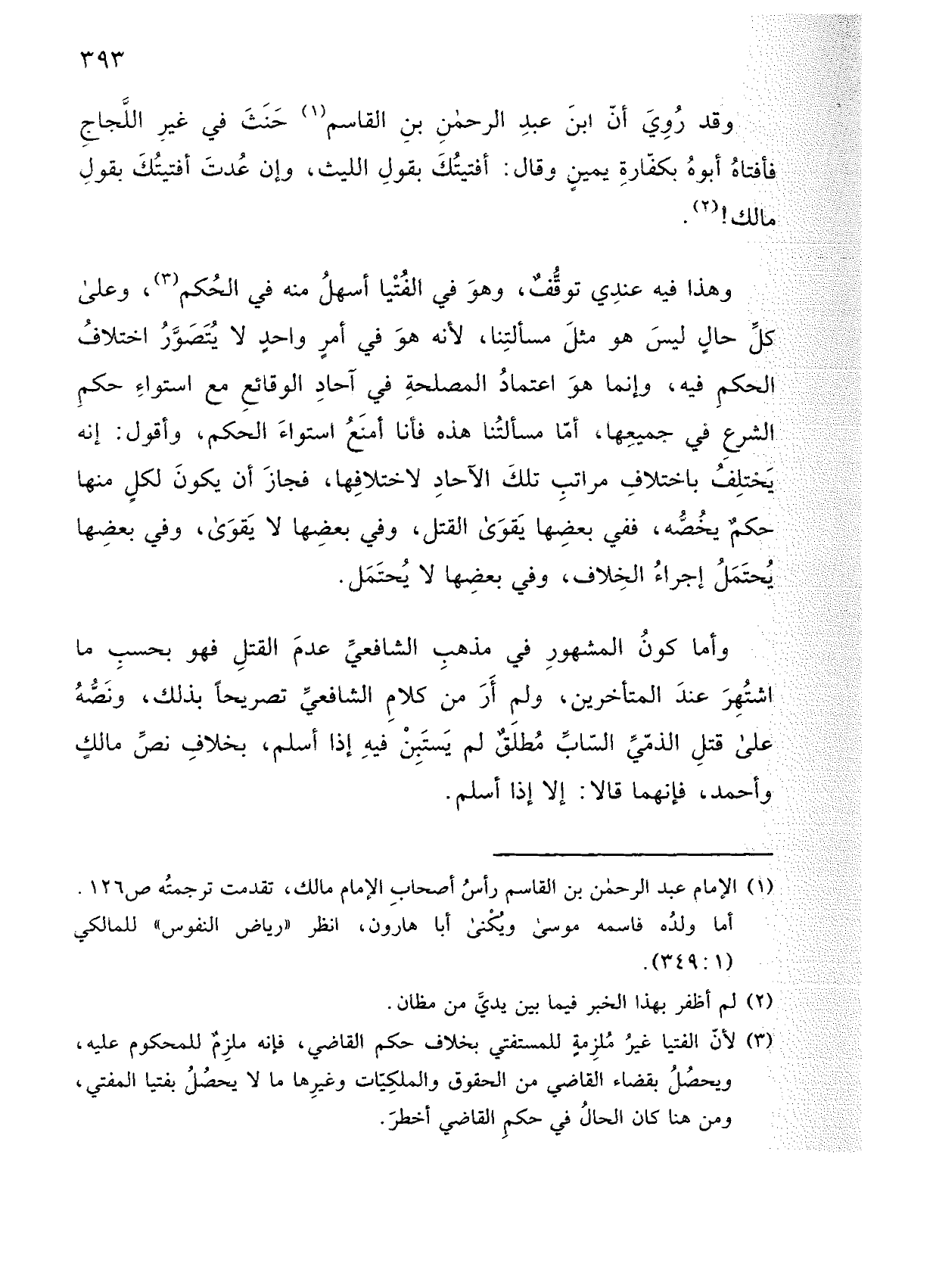 وهذا فيه عندي توقف، وهو في الفتيا أسهل منه في الحكم، وعلى كل حال ليس هو مثل مسألتنا، لأنه هو في أمر واحد لا يتصور اختلاف الحكم فيه، وإنما هو اعتماد المصلحة في آحاد الوقائع مع استواء حكم الشرع في جميعها، أما مسألتنا هذه فأنا أمنع استواء الحكم، وأقول: إنه يختلف باختلاف مراتب تلك الآحاد لاختلافها، فجاز أن يكون لكل منها حكم يخصه، ففي بعضها يقوي القتل، وفي بعضها لا يقوي، وفي بعضها يحتمل إجراء الخلاف، وفي بعضها لا يحتمل.