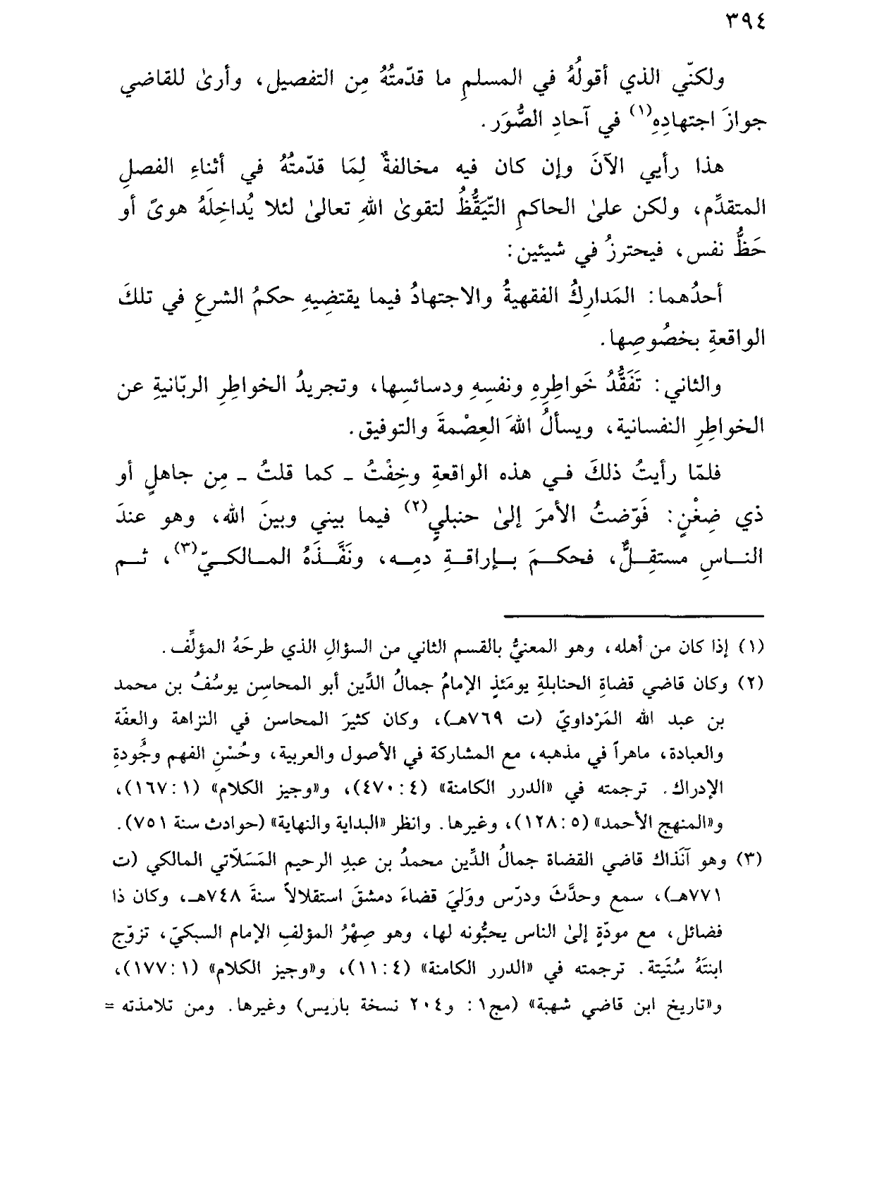 فلما رأيت ذلك في هذه الواقعة وخفت ـ كما قلت ـ من جاهل أو ذي ضغن: فوضت الأمر إلى حنبلي فيما بيني وبين الله، وهو عند الناس مستقل، فحكم بإراقة دمه، ونفذه المالكي، ثم