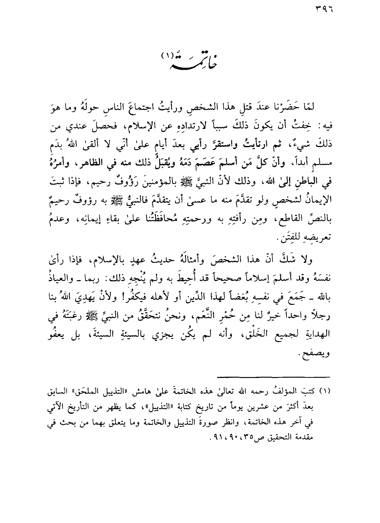 لما حضرنا عند قتل هذا الشخص ورأيت اجتماع الناس حوله وما هو فيه: خفت أن يكون ذلك سببًا لارتداده عن الإسلام، فحصل عندي من ذلك شيء، ثم ارتأيت واستقر رأيي بعد أيام على أني لا ألقى الله بدم مسلم أبدًا، وأن كل من أسلم عصم دمه ويقبل ذلك منه في الظاهر، وأمره في الباطن إلى الله، وذلك لأن النبي صلى الله عليه وسلم بالمؤمنين رؤوف رحيم، فإذا ثبت الإيمان لشخص ولو تقدم منه ما عسى أن يتقدم فالنبي صلى الله عليه وسلم به رؤوف رحيم بالنص القاطع، ومن رأفته به ورحمته محافظتنا على بقاء إيمانه، وعدم تعريضه للفتن.