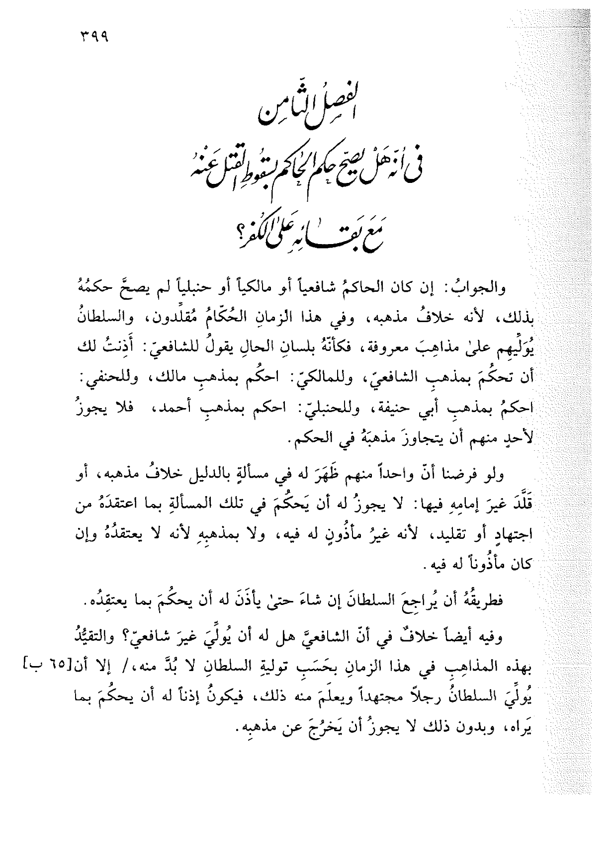 الفصل الثامن: في أنه هل يصح حكم الحاكم بسقوط القتل عنه مع بقائه على الكفر؟