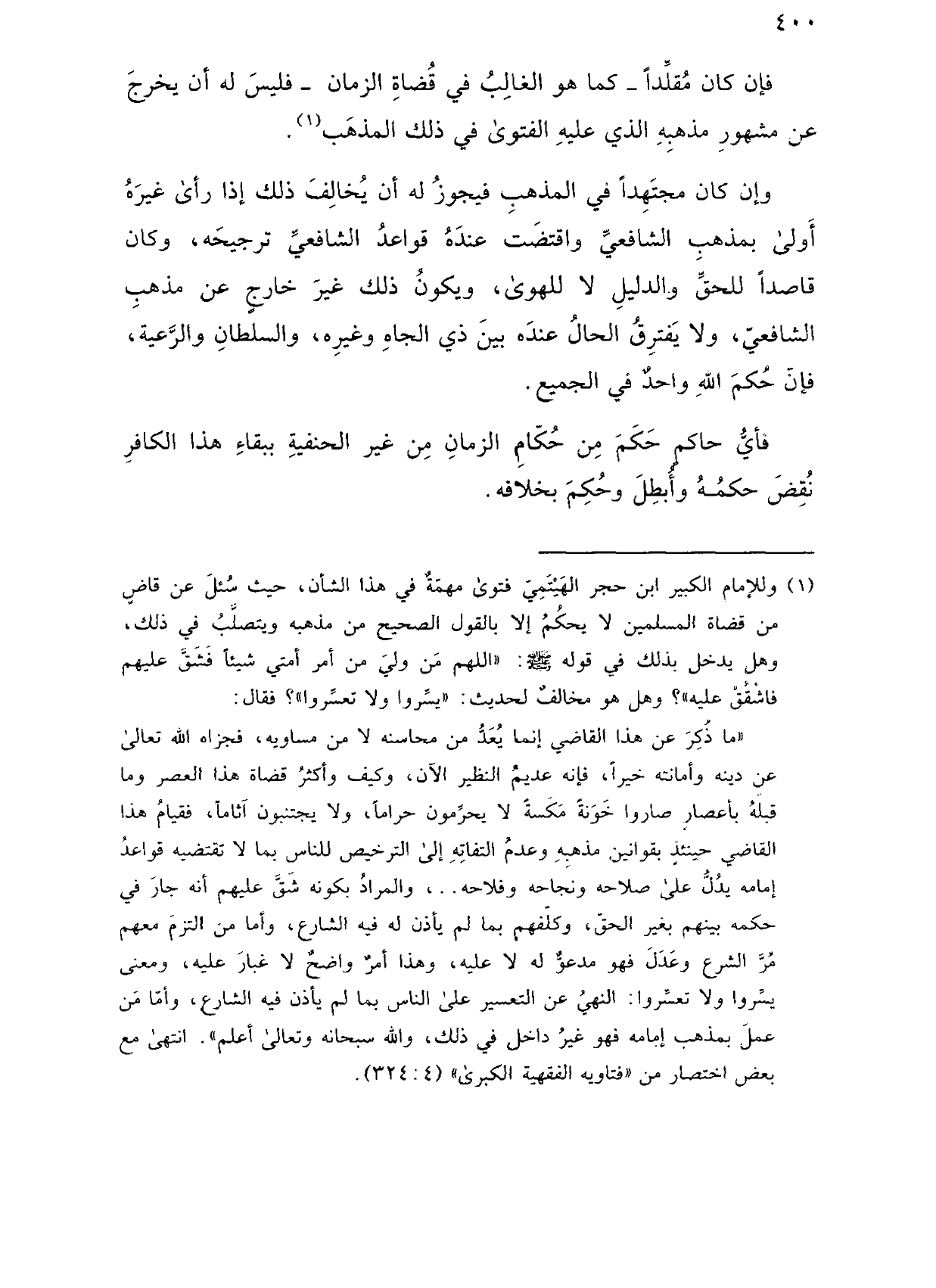 فأي حاكم حكم من حكام الزمان من غير الحنفية ببقاء هذا الكافر نقض حكمه وأبطل وحكم بخلافه.