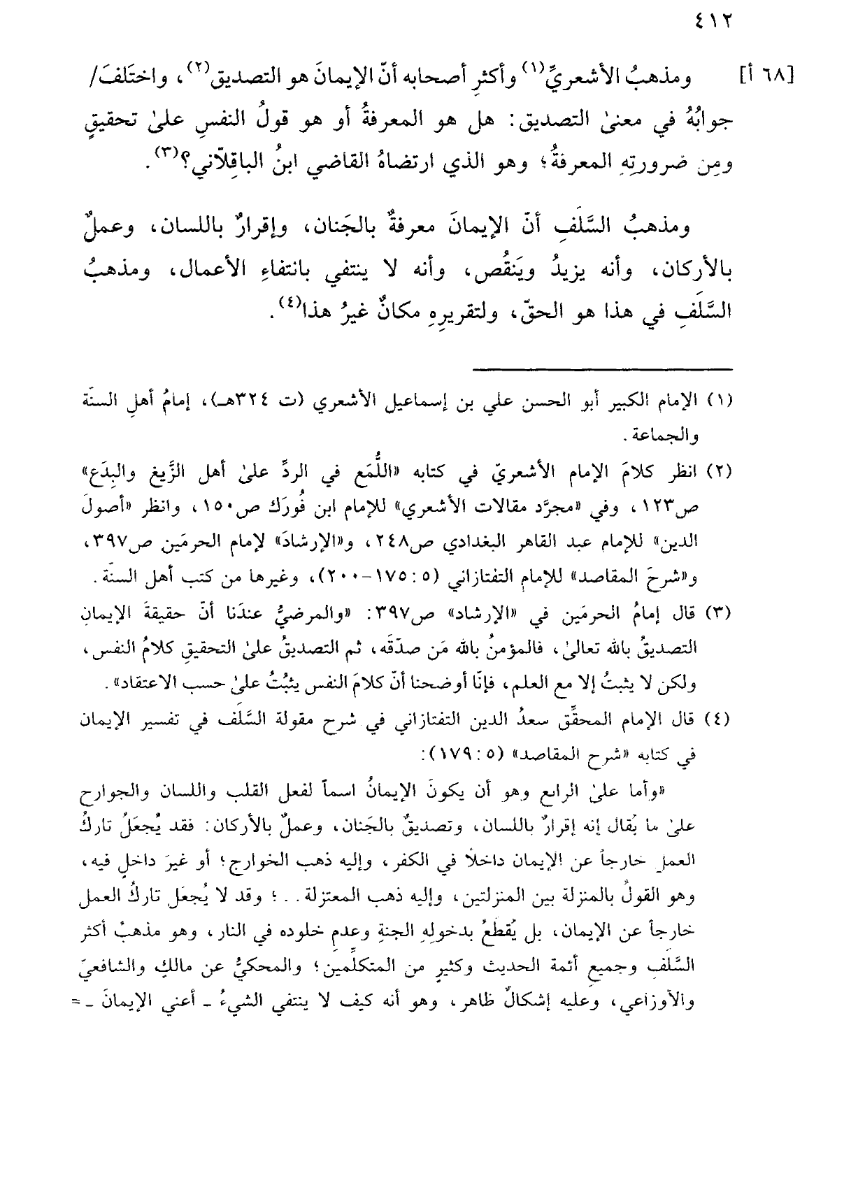 ومذهب الأشعري وأكثر أصحابه أن الإيمان هو التصديق، واختلف/ جوابه في معنى التصديق: هل هو المعرفة أو هو قول النفس على تحقيق ومن ضرورته المعرفة؛ وهو الذي ارتضاه القاضي ابن الباقلاني؟.