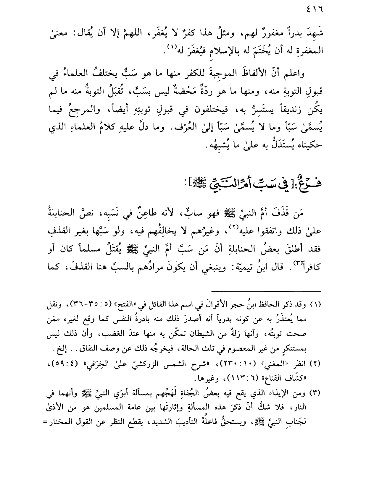 واعلم أن الألفاظ الموجبة للكفر منها ما هو سب يختلف العلماء في قبول التوبة منه، ومنها ما هو ردة محضة ليس بسب، تقبل التوبة منه ما لم يكن زنديقًا يستر به، فيختلفون في قبول توبته أيضًا، والمرجع فيما يسمى سبًا وما لا يسمى سبًا إلى العرف. وما دل عليه كلام العلماء الذي حكيناه يستدل به على ما يشبهه.