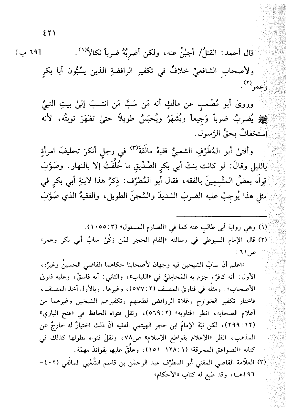 ولأصحاب الشافعي خلاف في تكفير الرافضة الذين يسبون أبا بكر وعمر.