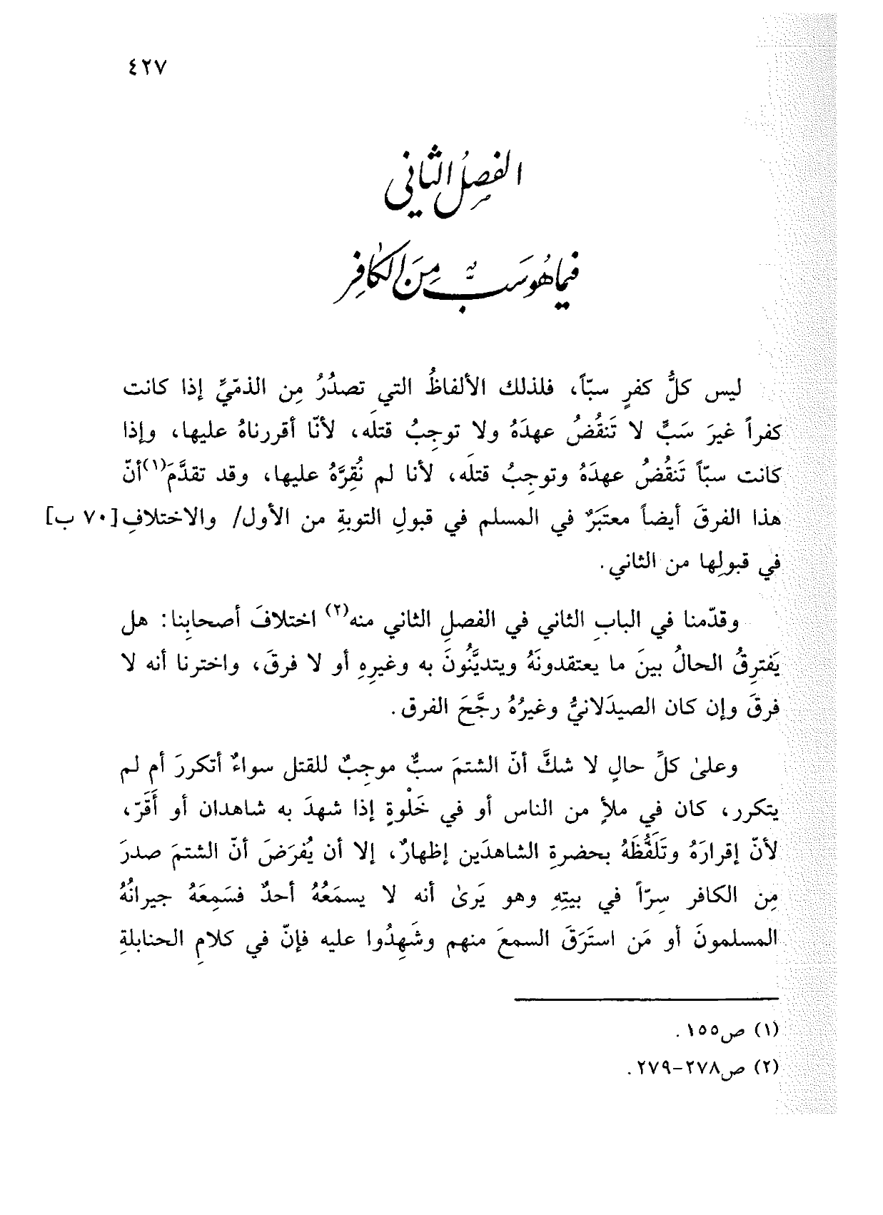 ليس كل كفر سبًا، فلذلك الألفاظ التي تصدر من الذمي إذا كانت كفرًا غير سب لا تنقض عهده ولا توجب قتله، لأنا أقررناه عليها، وإذا كانت سبًا تنقض عهده وتوجب قتله، لأنا لم نقره عليها، وقد تقدم أن هذا الفرق أيضًا معتبر في المسلم في قبول التوبة من الأول/ والاختلاف في قبولها من الثاني.