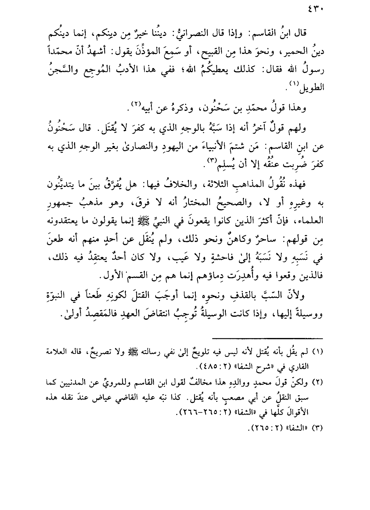 فهذه نقول المذاهب الثلاثة، والخلاف فيها: هل يفرق بين ما يتدينون به وغيره أو لا، والصحيح المختار أنه لا فرق، وهو مذهب جمهور العلماء، فإن أكثر الذين كانوا يقعون في النبي صلى الله عليه وسلم إنما يقولون ما يعتقدونه من قولهم: ساحر وكاهن ونحو ذلك، ولم ينقل عن أحد منهم أنه طعن في نسبه ولا نسبه إلى فاحشة ولا عيب، ولا كان أحد يعتقد فيه ذلك، فالذين وقعوا فيه وأهدرت دماؤهم إنما هم من القسم الأول.
