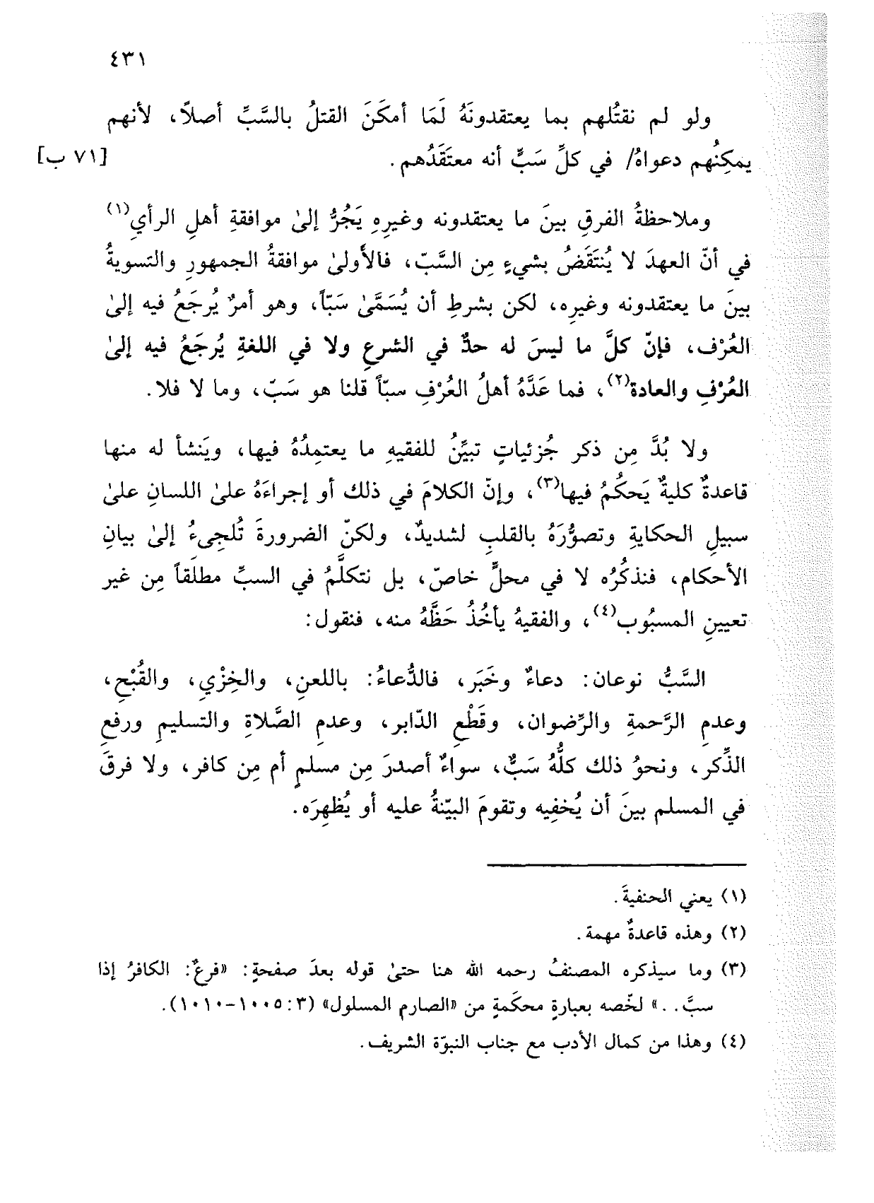 وملاحظة الفرق بين ما يعتقدونه وغيره يجر إلى موافقة أهل الرأي في أن العهد لا ينتقض بشيء من السب، فالأولى موافقة الجمهور والتسوية بين ما يعتقدونه وغيره، لكن بشرط أن يسمى سبًا، وهو أمر يرجع فيه إلى العرف، فإن كل ما ليس له حد في الشرع ولا في اللغة يرجع فيه إلى العرف والعادة، فما عدة أهل العرف سبًا قلنا هو سب، وما لا فلا.