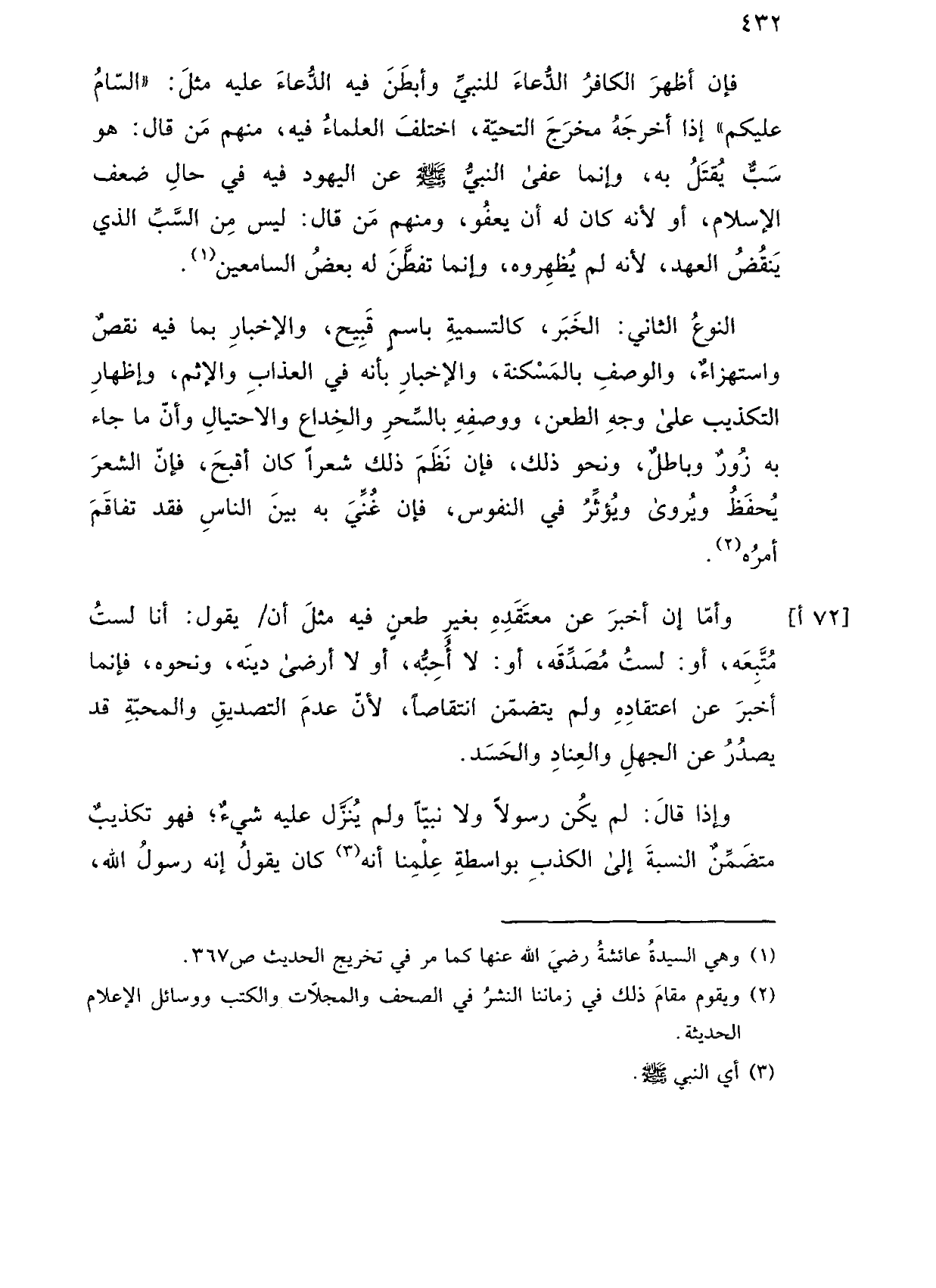 وأما إن أخبر عن معتقده بغير طعن فيه مثل أن/ يقول: أنا لست متبعه، أو: لست مصدقه، أو: لا أحبه، أو لا أرضى دينه، ونحوه، فإنما أخبر عن اعتقاده ولم يتضمن انتقاصًا، لأن عدم التصديق والمحبة قد يصدر عن الجهل والعناد والحسد.