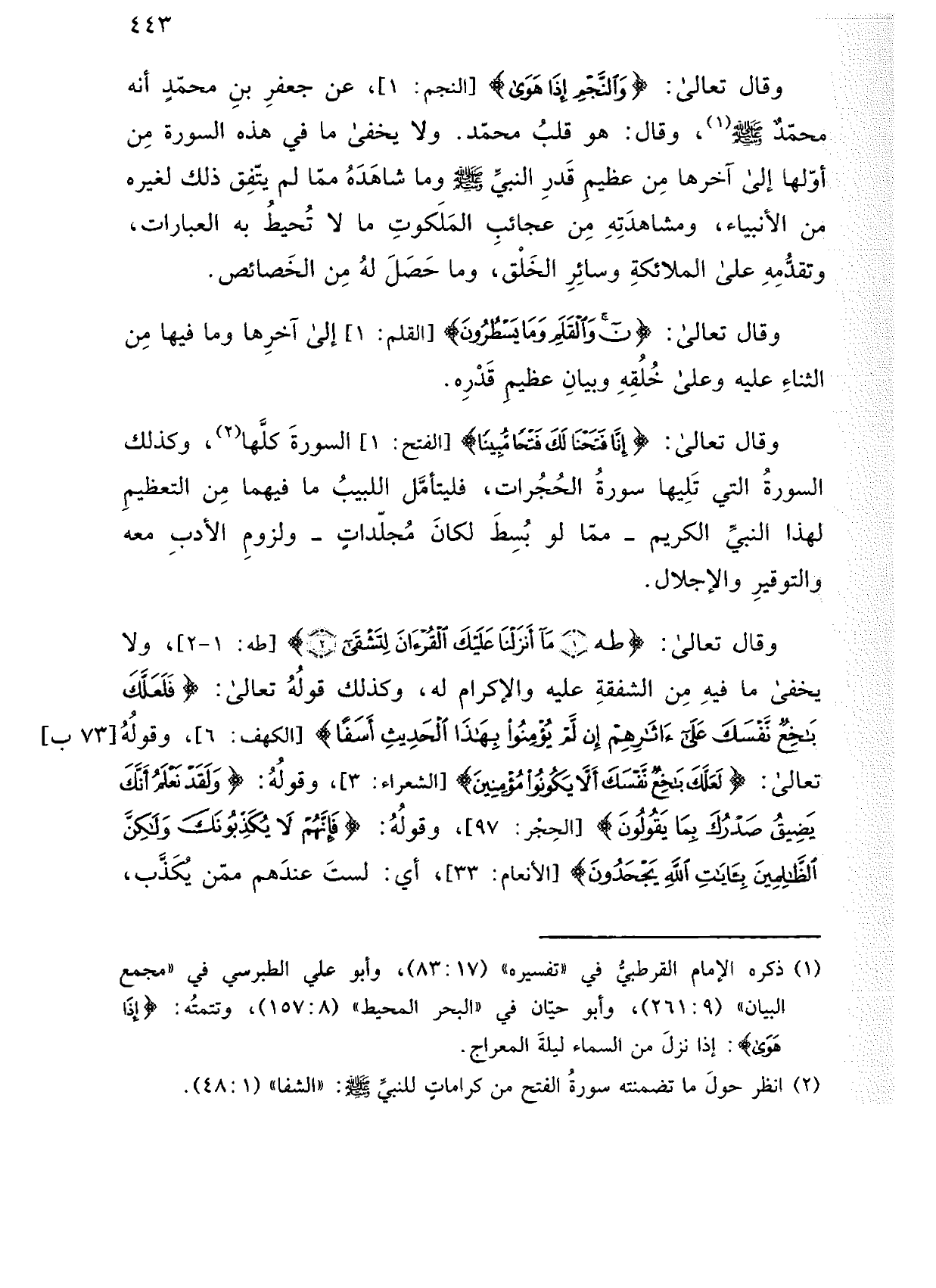 وقال تعالى: (والنجم إذا هوى) [النجم: 1]، عن جعفر بن محمد أنه محمد صلى الله عليه وسلم، وقال: هو قلب محمد. ولا يخفى ما في هذه السورة من أولها إلى آخرها من عظيم قدر النبي صلى الله عليه وسلم وما شاهده مما لم يتفق ذلك لغيره من الأنبياء، ومشاهدته من عجائب الملكوت ما لا تحيط به العبارات، وتقدمه على الملائكة وسائر الخلق، وما حصل له من الخصائص.