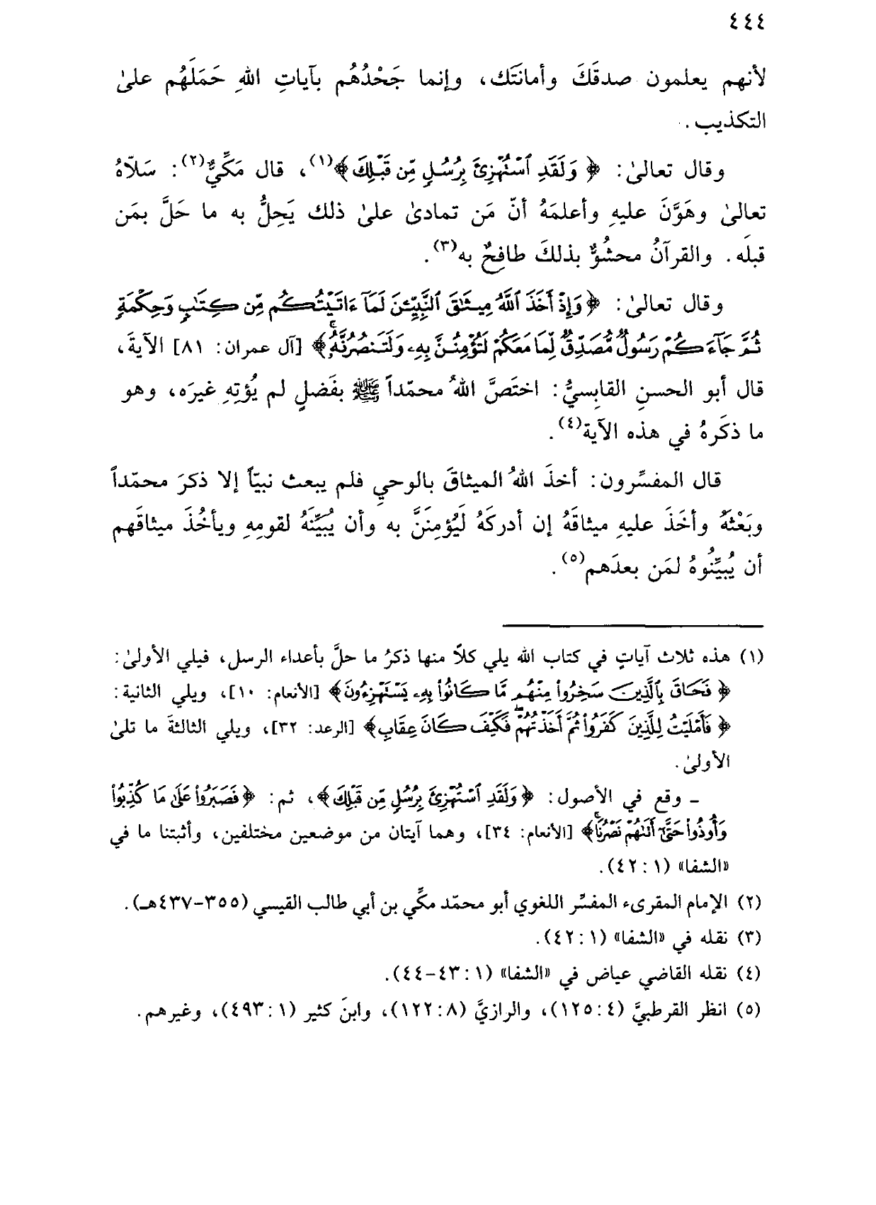 وقال تعالى: (وإذ أخذ الله ميثاق النبيين لما أتيتكم من كتب وحكمة ثم جاءكم رسول مصدق لما معكم لتؤمنن به ولتنصرنه) [آل عمران: 81] الآية، قال أبو الحسن القابسي: اختص الله محمدًا صلى الله عليه وسلم بفضل لم يؤته غيره، وهو ما ذكره في هذه الآية.