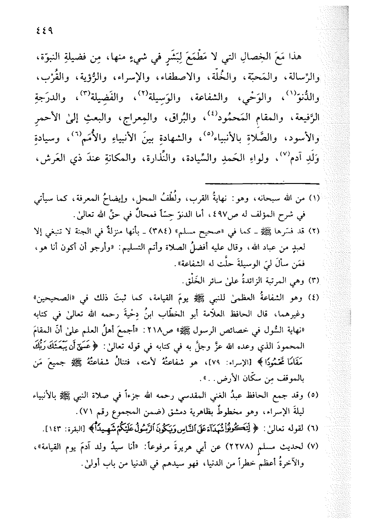 هذا مع الخصال التي لا مطمع لبشر في شيء منها، من فضيلة النبوة، والرسالة، والمحبة، والنخلة، والاصطفاء، والإسراء، والرؤية، والقرب، والدنو، والوحي، والشفاعة، والوسيلة، والفضيلة، والدرجة الرفيعة، والمقام المحمود، والبراق، والمعراج، والبعث إلى الأحمر والأسود، والصلاة بالأنبياء، والشهادة بين الأنبياء والأمم، وسيادة ولد آدم، ولواء الحمد والسيادة، والنذارة، والمكانة عند ذي العرش،