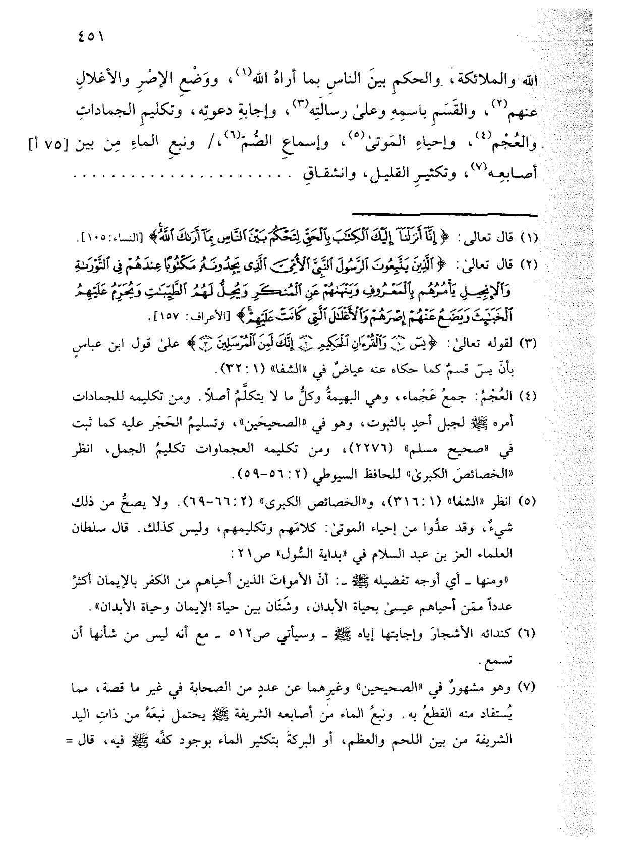 الله والملائكة، والحكم بين الناس بما أراه الله، ووضع الإصر والأغلال عنهم، والقسم باسمه وعلى رسالته، وإجابة دعوته، وتكليم الجمادات والعجم، وإحياء الموتى، وإسماع الصم،/ ونبع الماء من بين أصابعه، وتكثير القليل، وانشقاق .....................................
