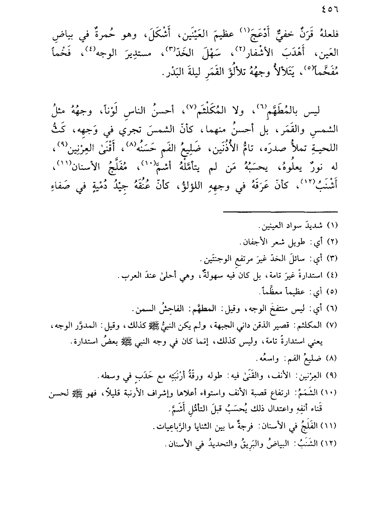 فلعله قرن خفي أدعج عظيم العينين، أشكل، وهو حمرة في بياض العين، أهدب الأشفار، سهل الخد، مستدير الوجه، فخمًا مفخمًا، يتلألأ وجهه تلألؤ القمر ليلة البدر.