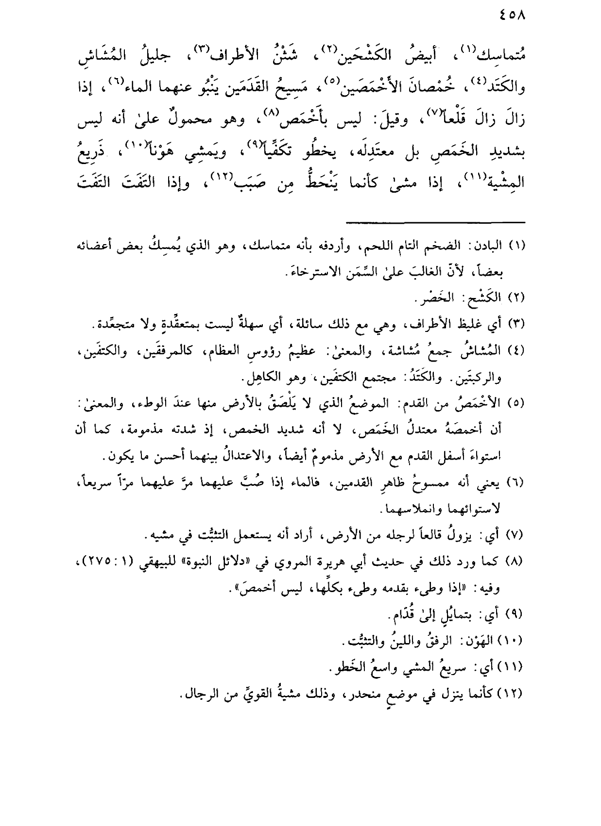 متماسك، أبيض الكشحين، شثن الأطراف، جليل المشاش والكتد، خمصان الأخمصين، مسيح القدمين ينبو عنهما الماء، إذا زال زال قلعا، وقيل: ليس بأخمص، وهو محمول على أنه ليس بشديد الخمص بل معتدله، يخطو تكفيا، ويمشي هونا، ذريع المشية، إذا مشى كأنما ينحط من صبب، وإذا التفت التفت
