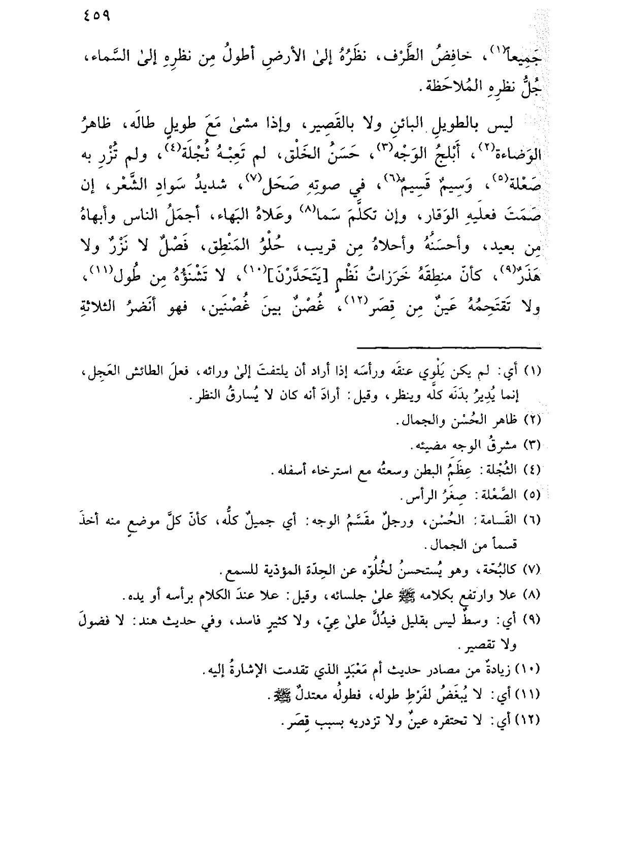 ليس بالطويل البائن ولا بالقصير، وإذا مشى مع طويل طاله، ظاهر الوضاءة، أبلج الوجه، حسن الخلق، لم تبعه ثجلة، ولم تزر به صعلة، وسيم قسيم، في صوته صحل، شديد سواد الشعر، إن صمت فعليه الوقار، وإن تكلم سما وعلاه البهاء، أجمل الناس وأبهاه من بعيد، وأحسنه وأحلاه من قريب، حلو المنطق، فصل لا نزر ولا هذر، كأنه منطقه خرازات نظم [يتحدرن]، لا تشنؤه من طول، ولا تقتحمه عين من قصر، غصن بين غصنين، فهو أنضر الثلاثة