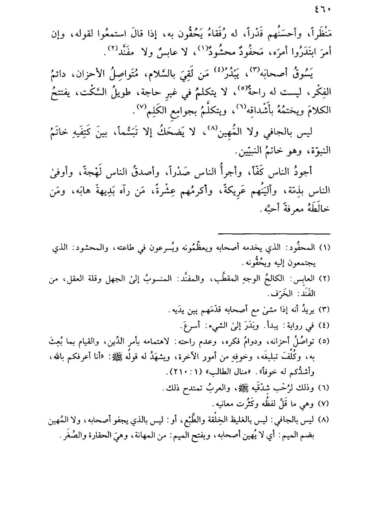 منظرًا، وأحسنهم قدرًا، له رفقاء يحفون به، إذا قال استمعوا لقوله، وإن أمر ابتدروا أمره، محفود محشود، لا عابس ولا مفند.