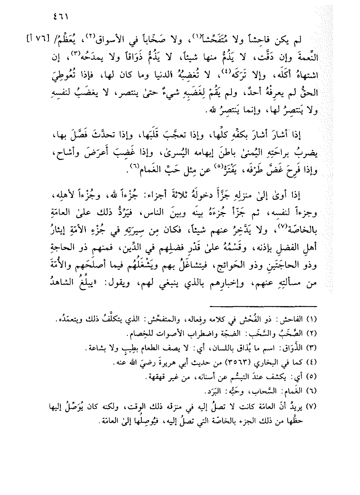 إذا أوى إلى منزله جزأ دخوله ثلاثة أجزاء: جزءاً لله، وجزءًا لأهله، وجزءًا لنسه، ثم جزأ جزءه بينه وبين الناس، فيرد ذلك على العامة بالخاصة، ولا يدخر عنهم شيئًا، فكان من سيرته في جزء الأمة إيثار أهل الفضل بإذنه، وقسمه على قدر فضلهم في الدين، فمنهم ذو الحاجة وذو الحاجتين وذو الحوائج، فيتشاغل بهم ويشغلهم فيما أصلحهم والأمة من مسألته عنهم، وإخبارهم بالذي ينبغي لهم، ويقول: "يبلغ الشاهد