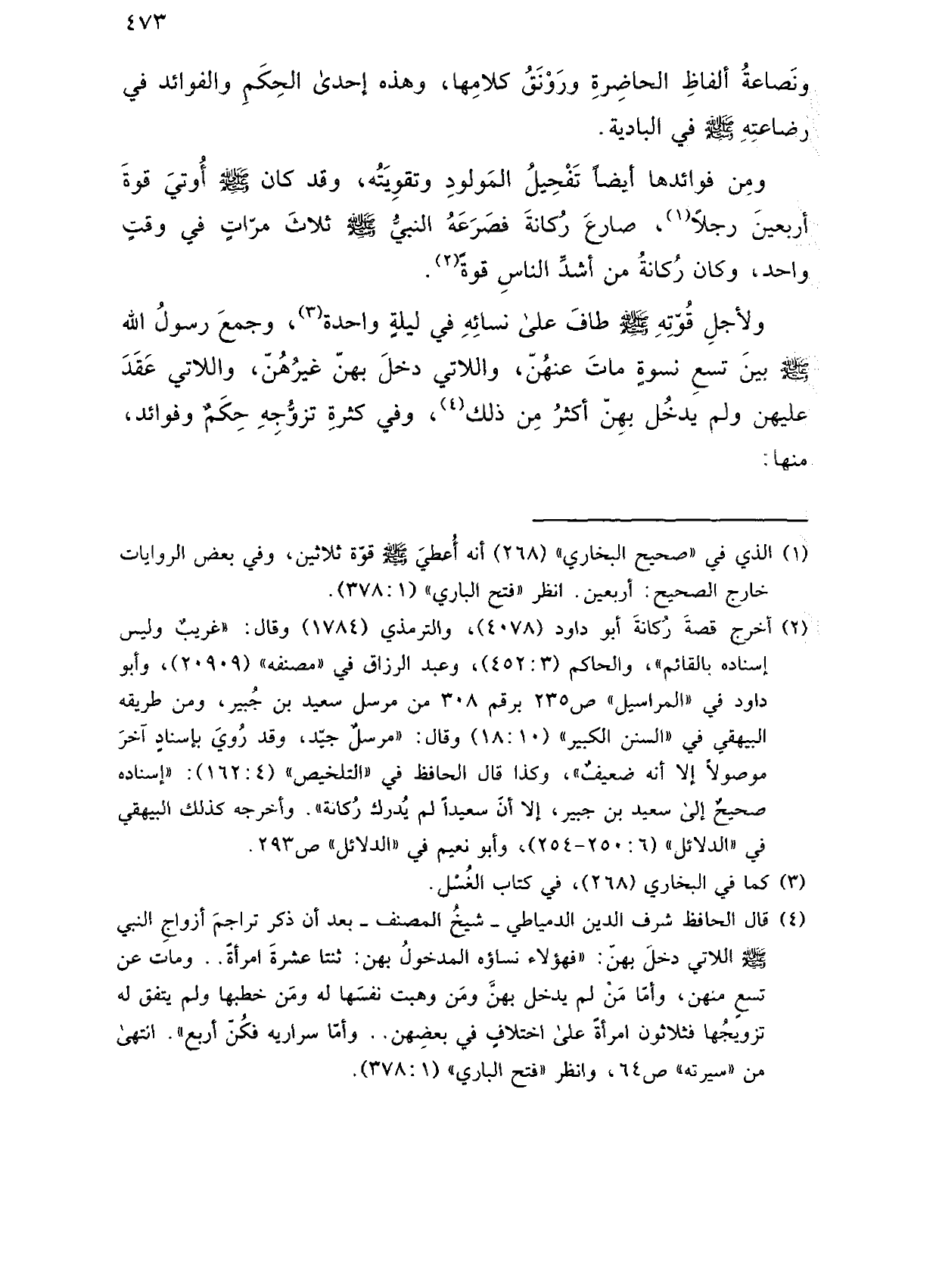 ولأجل قوته صلى الله عليه وسلم طاف على نسائه في ليلة واحدة، وجمع رسول الله صلى الله عليه وسلم بين تسع نسوة مات عنهن، واللاتي دخل بهن غيرهن، واللاتي عقد عليهن ولم يدخل بهن أكثر من ذلك، وفي كثرة تزوجه حكم وفوائد، منها: