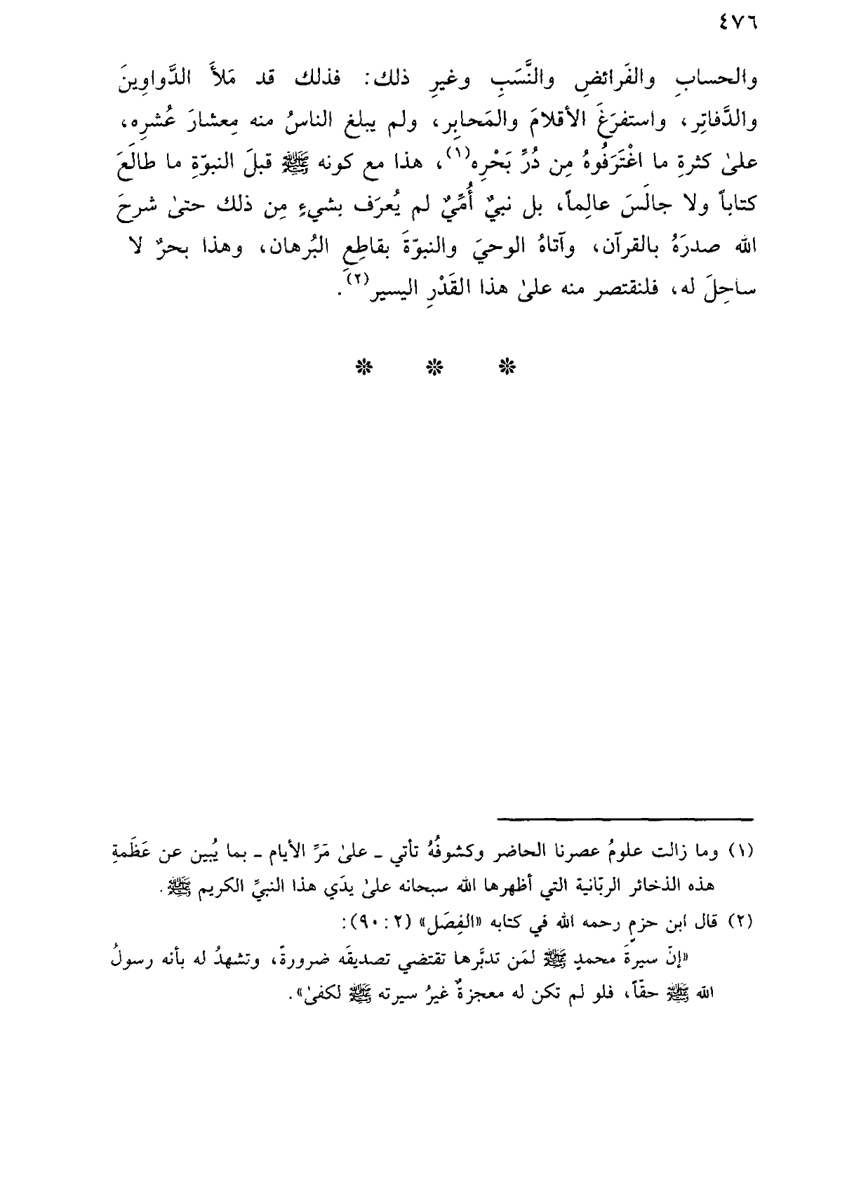 والحساب والفرائض والنسب وغير ذلك: فذلك قد ملأ الدواوين والدفاتر، واستفرغ الأقلام والمحابر، ولم يبلغ الناس منه معشار عشره، على كثرة ما اغترفوه من در بحره، هذا مع كونه صلى الله عليه وسلم قبل النبوة ما طالع كتابًا ولا جالس عالمًا، بل نبي أمي لم يعرف بشيء من ذلك حتى شرح الله صدره بالقرآن، وآتاه الوحي والنبوة بقاطع البرهان، وهذا بحر لا ساحل له، فلنقتصر منه على هذا القدر اليسير.