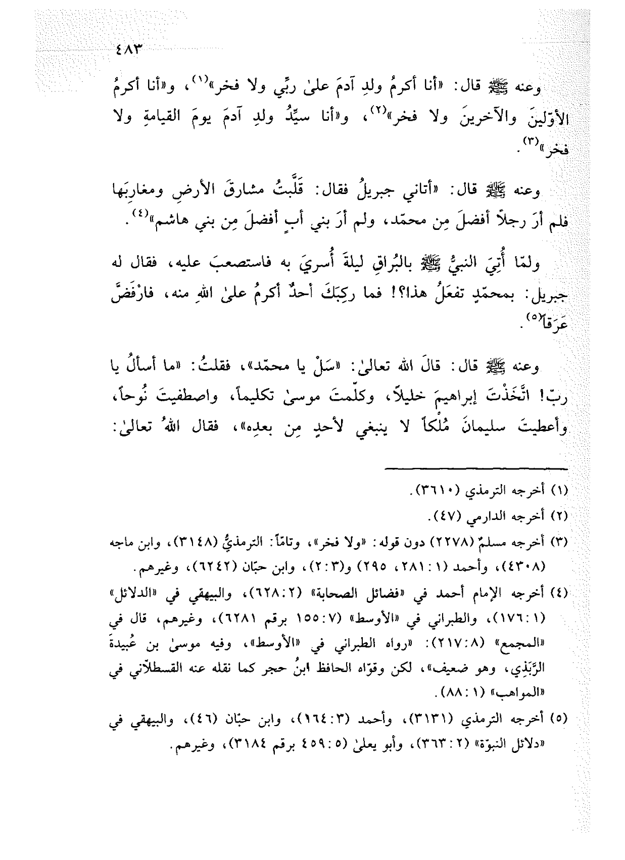 وعنه صلى الله عليه وسلم قال: "أنا أكرم ولد آدم على ربي ولا فخر"، و"أنا أكرم الأولين والآخرين ولا فخر"، و"أنا سيد ولد آدم يوم القيامة ولا فخر".