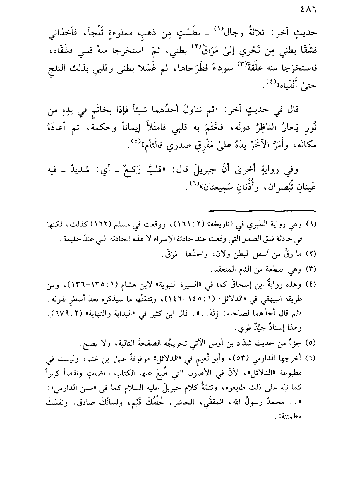 حديث آخر: ثلاثة رجال ـ بطست من ذهب مملوءة ثلجًا، فأخذاني فشقا بطني من نحري إلى مراق بطني، ثم استخرجا منه قلبي فشقاه، فاستخرجا منه علقة سوداء فطرحاها، ثم غسلا بطني وقلبي بذلك الثلج حتى أنقياه".