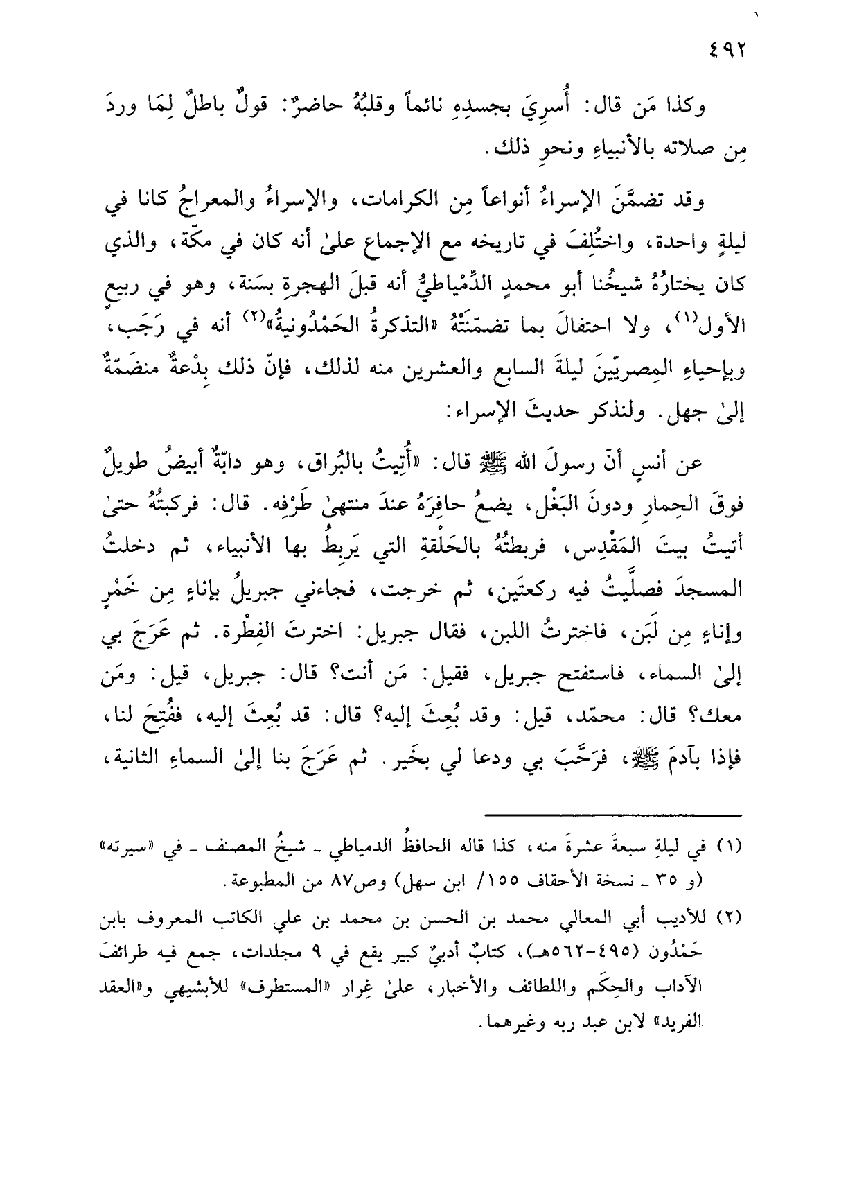 وقد تضمن الإسراء أنواعًا من الكرامات، والإسراء والمعراج كانا في ليلة واحدة، واختلف في تاريخه مع الإجماع على أنه كان في مكة، والذي كان يختاره شيخنا أبو محمد الدمياطي أنه قبل الهجرة بسنة، وهو في ربيع الأول، ولا احتفال بما تضمنته "التذكرة الحمدونية" أنه في رجب، وبإحياء المصريين ليلة السابع والعشرين منه لذلك، فإن ذلك بدعة منضمة إلى جهل. ولنذكر حديث الإسراء: