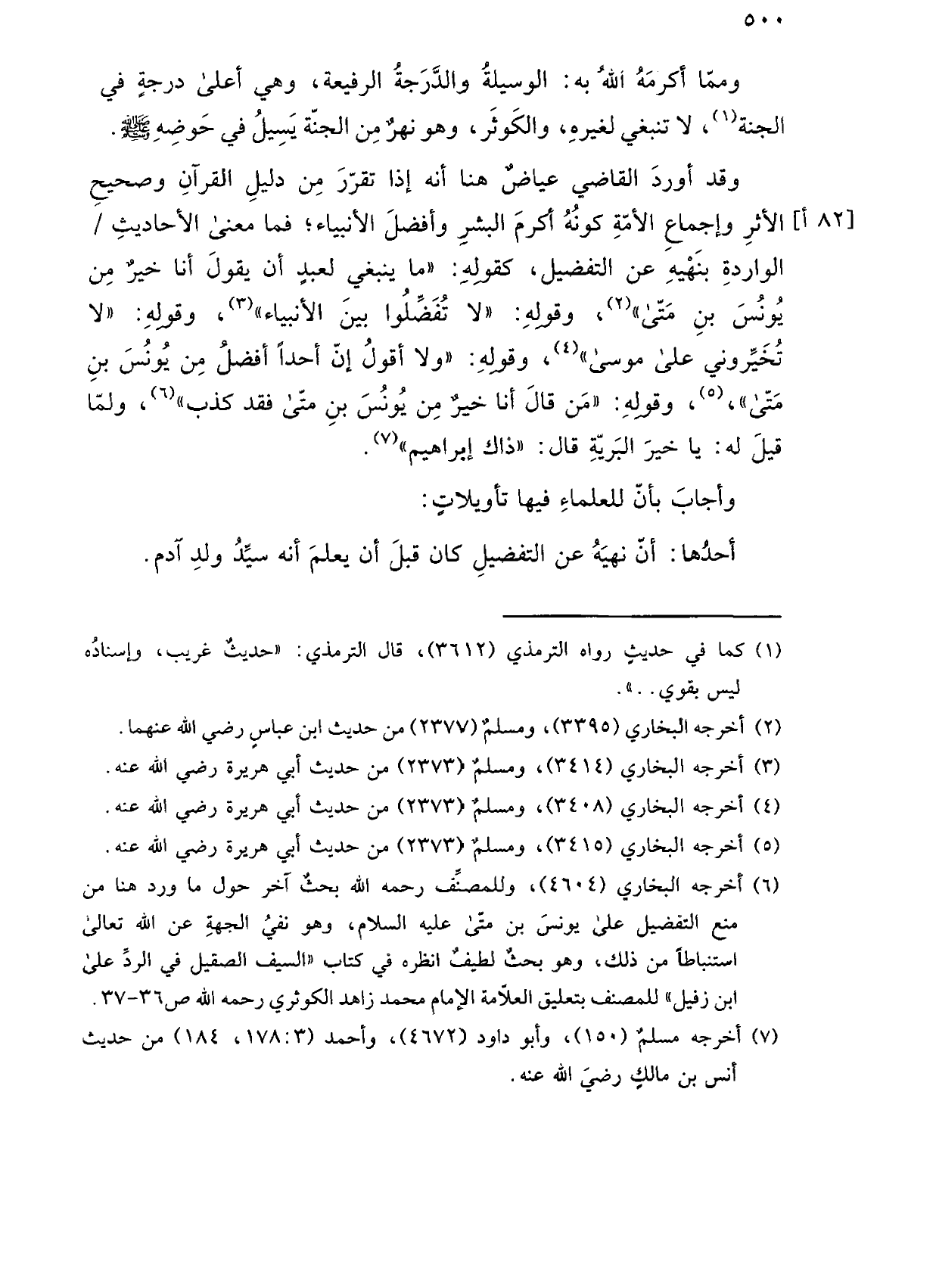وقد أورد القاضي عياض هنا أنه إذا تقرر من دليل القرآن وصحيح الأثر وإجماع الأمة كونه أكرم البشر وأفضل الأنبياء؛ فما معنى الأحاديث/ الواردة بنهيه عن التفضيل، كقوله: "ما ينبغي لعبد أن يقول أنا خير من يونس بن متى"، وقوله: "لا تفضلوا بين الأنبياء"، وقوله: "لا تخيروني على موسى"، وقوله: "ولا أقول إن أحدًا أفضل من يونس بن متى"، وقوله: "من قال أنا خير من يونس بن متى فقد كذب"، ولما قيل له: يا خير البرية قال: "ذاك إبراهيم".