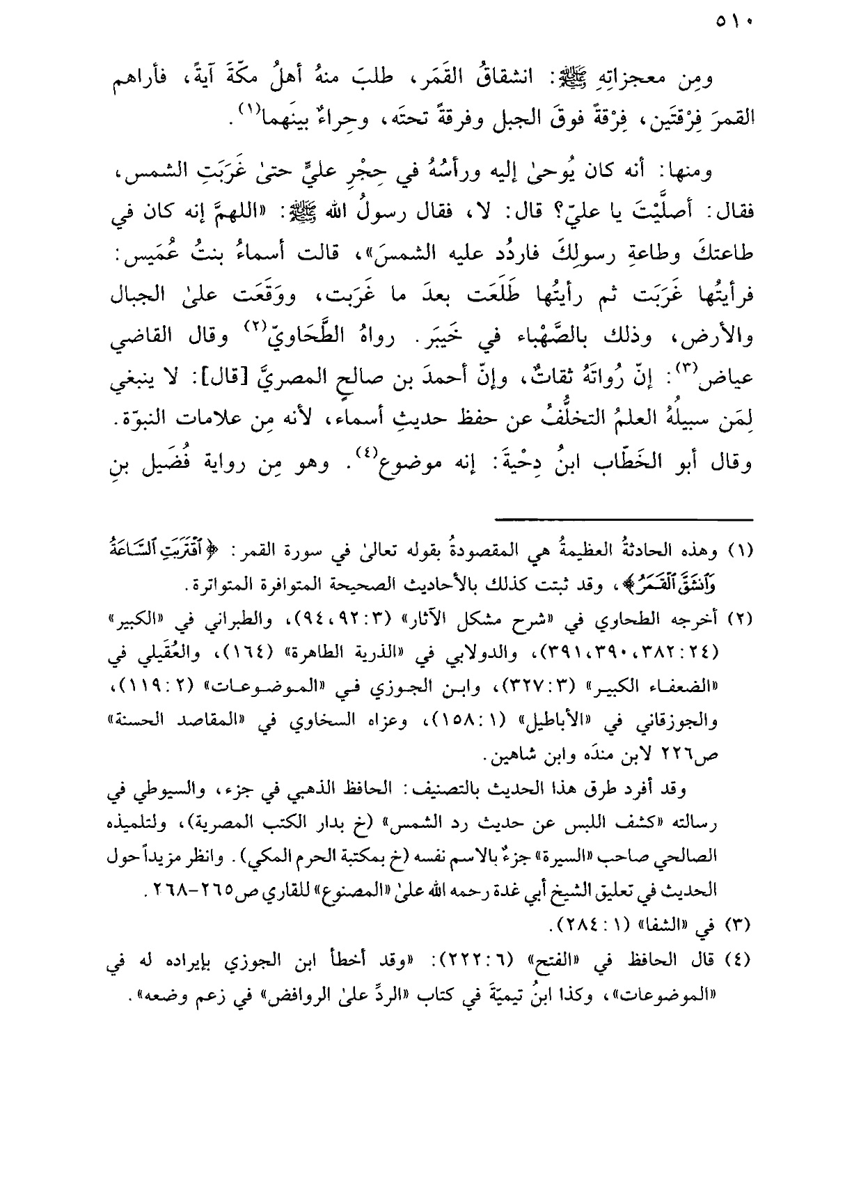 ومنها: أنه كان يوحى إليه ورأسه في حجر علي حتى غربت الشمس، فقال: أصليت يا علي؟ قال: لا، فقال رسول الله صلى الله عليه وسلم: "اللهم إنه كان في طاعتك وطاعة رسولك فاردد عليه الشمس"، قالت أسماء بنت عميس: فرأيتها غربت ثم رأيتها طلعت بعد ما غربت، ووقعت على الجبال والأرض، وذلك بالصهباء في خيبر. رواه الطحاوي وقال القاضي عياض: إن رواته ثقات، وإن أحمد بن صالح المصري [قال]: لا ينبغي لمن سبيله العلم التخلف عن حفظ حديث أسماء، لأنه من علامات النبوة. وقال أبو الخطاب ابن دحية: إنه موضوع. وهو من رواية فضيل بن