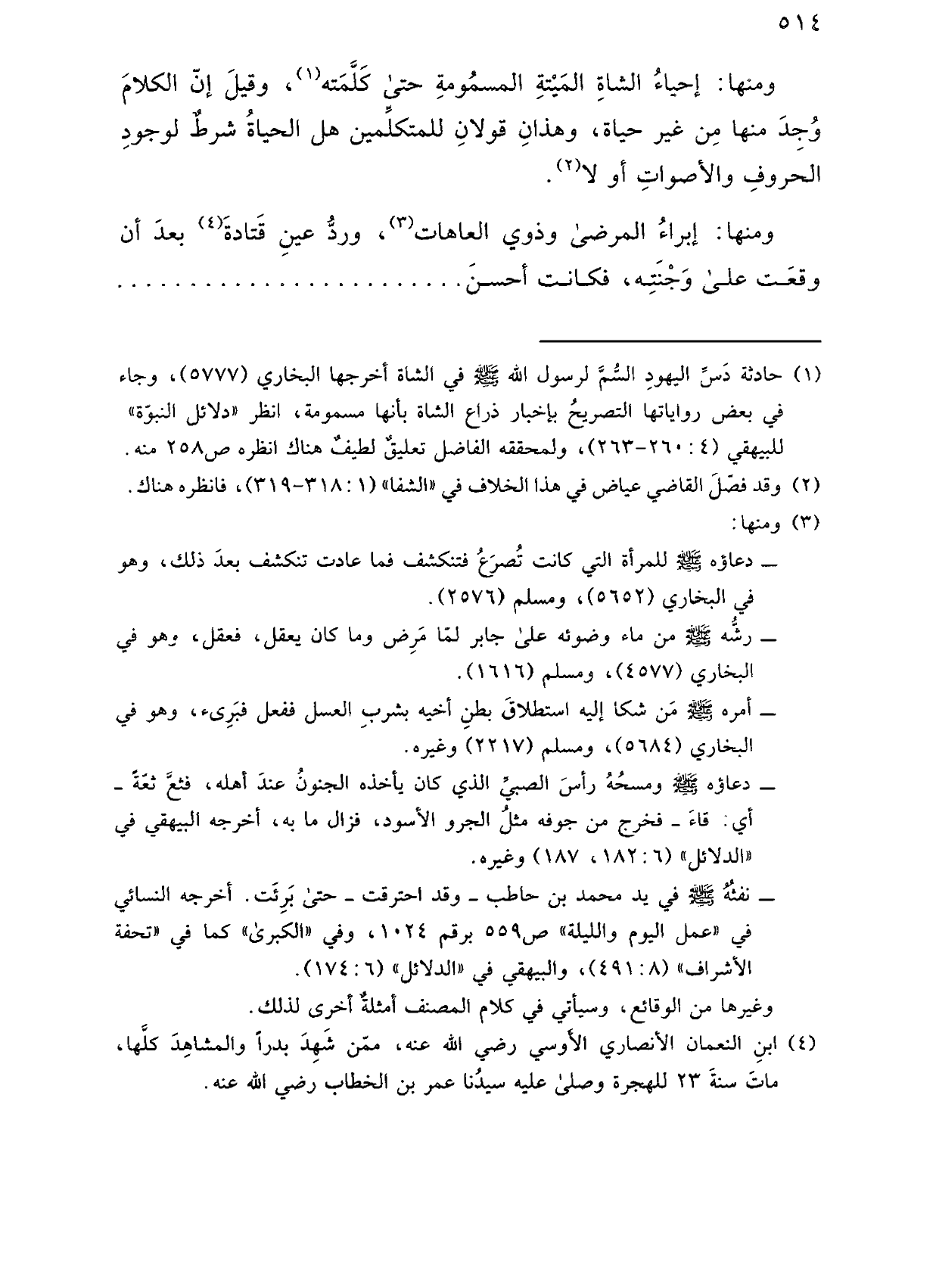 ومنها: إحياء الشاة الميتة المسمومة حتى كلمته، وقيل إن الكلام وجد منها من غير حياة، وهذان قولان للمتكلمين هل الحياة شرط لوجود الحروف والأصوات أو لا.