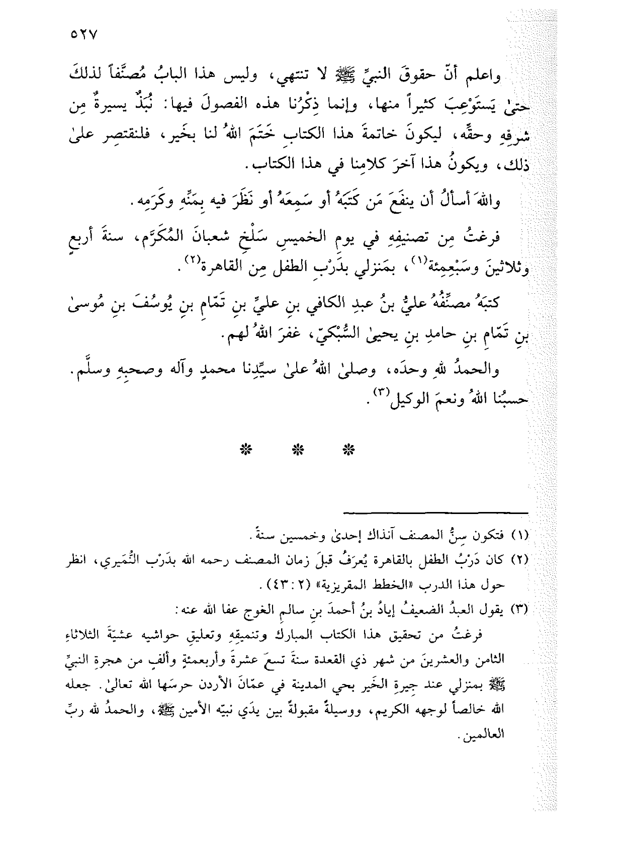 واعلم أن حقوق النبي صلى الله عليه وسلم لا تنتهي، وليس هذا الباب مصنفًا لذلك حتى يستوعب كثيرًا منها، وإنما ذكرنا هذه الفصول فيها: نبذ يسيرة من شرفه وحقه، ليكون خاتمة هذا الكتاب ختم الله لنا بخير، فلنقتصر على ذلك، ويكون هذا آخر كلامنا في هذا الكتاب.