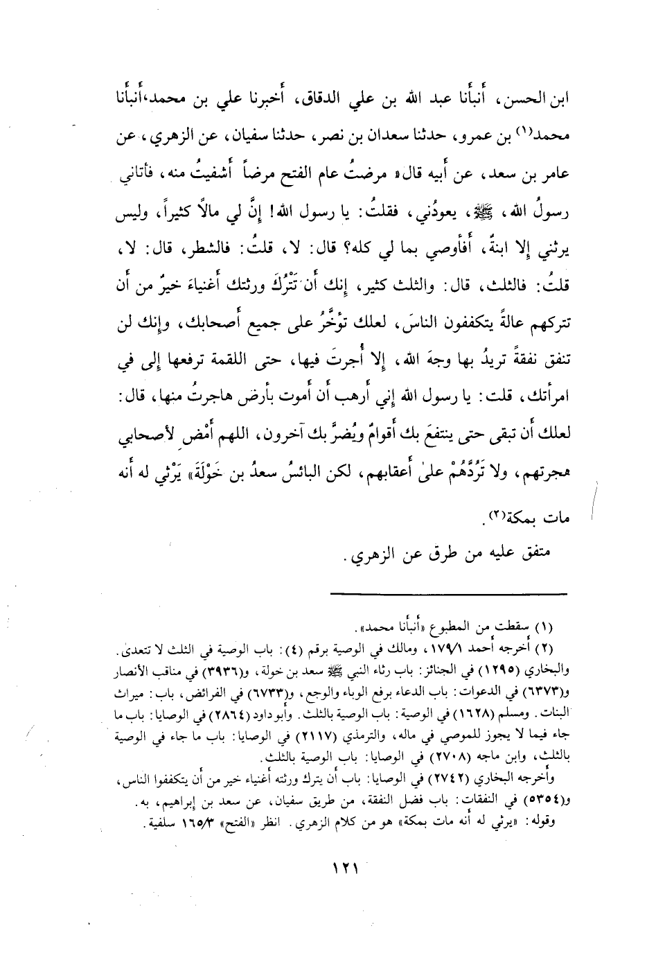 بنُ الحَسَنِ، أَنْبَأَنَا عَبْدُ اللهِ بنُ عَلِيٍّ الدّقَاقُ، أَخْبَرَنَا عَلِيُّ بنُ مُحَمَّدٍ، أَنْبَأَنَا مُحَمَّدُ (1) بنُ عَمْرٍو، حَدَّثَنَا سَعْدَانُ بنُ نَصْرٍ، حَدَّثَنَا سُفْيَانُ، عَنِ الزُّهْرِيِّ، عَنْ عَامِرِ بنِ سَعْدٍ، عَنْ أَبِيْهِ، قَالَ: