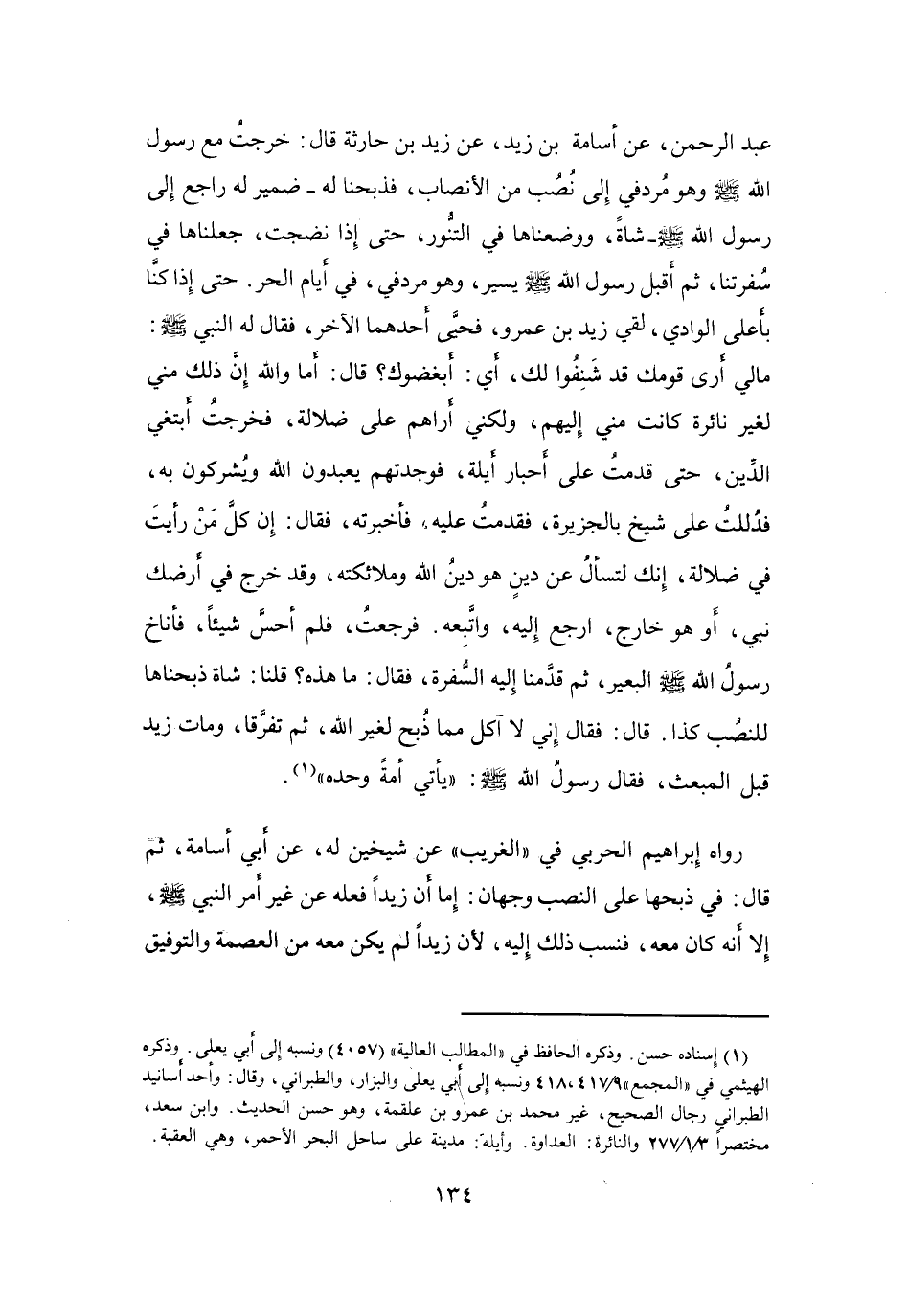خَرَجْتُ مَعَ رَسُوْلِ اللهِ -صَلَّى اللَّهُ عَلَيْهِ وَسَلَّمَ- وَهُوَ مُرْدِفِي إِلَى نُصُبٍ مِنَ الأَنْصَابِ، فَذَبَحْنَا لَهُ - ضَمِيْرُ (لَهُ) رَاجِعٌ إِلَى رَسُوْلِ اللهِ صَلَّى اللَّهُ عَلَيْهِ وَسَلَّمَ - شَاةً، وَوَضَعْنَاهَا فِي التَّنُّوْرِ، حَتَّى إِذَا نَضَجَتْ جَعَلْنَاهَا فِي سُفْرَتِنَا، ثُمَّ أَقْبَلَ رَسُوْلُ اللهِ -صَلَّى اللَّهُ عَلَيْهِ وَسَلَّمَ- يَسِيْرُ وَهُوَ مُرْدِفِي فِي أَيَّامِ الحَرِّ، حَتَّى إِذَا كُنَّا بِأَعْلَى الوَادِي لَقِيَ زَيْدَ بنَ عَمْرٍو، فَحَيَّى أَحَدُهُمَا الآخَرَ.