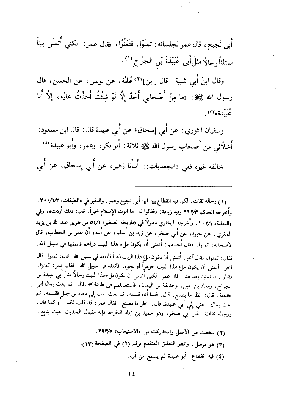قَالَ رَسُوْلُ اللهِ -صَلَّى اللَّهُ عَلَيْهِ وَسَلَّمَ-: (مَا مِنْ أَصْحَابِي أَحَدٌ إِلاَّ لَوْ شِئْتُ أَخَذْتُ عَليْهِ، إِلاَّ أَبَا عُبَيْدَةَ (3)) .