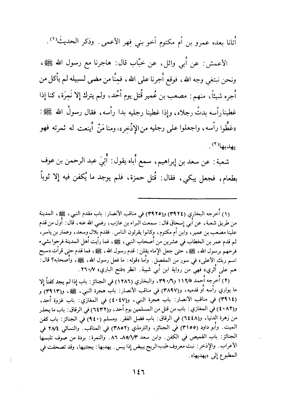 (2) أخرجه أحمد 5 / 112 و6 / 390، والبخاري (1286) في الجنائز: باب إذا لم يجد كفنا إلا ما يواري رأسه أو قدميه، و (3897) في مناقب الانصار: باب هجرة النبي، صلى الله عليه وسلم، (3913) و (3914) في مناقب الانصار: باب هجرة النبي، و (4047) في المغازي: باب غزوة أحد، و (4082) في المغازي: باب من قتل من المسلمين يوم أحد، و (6432) في الرقاق: باب ما يحذر من زهرة الدنيا، و (6448) في الرقاق: باب فضل الفقر.