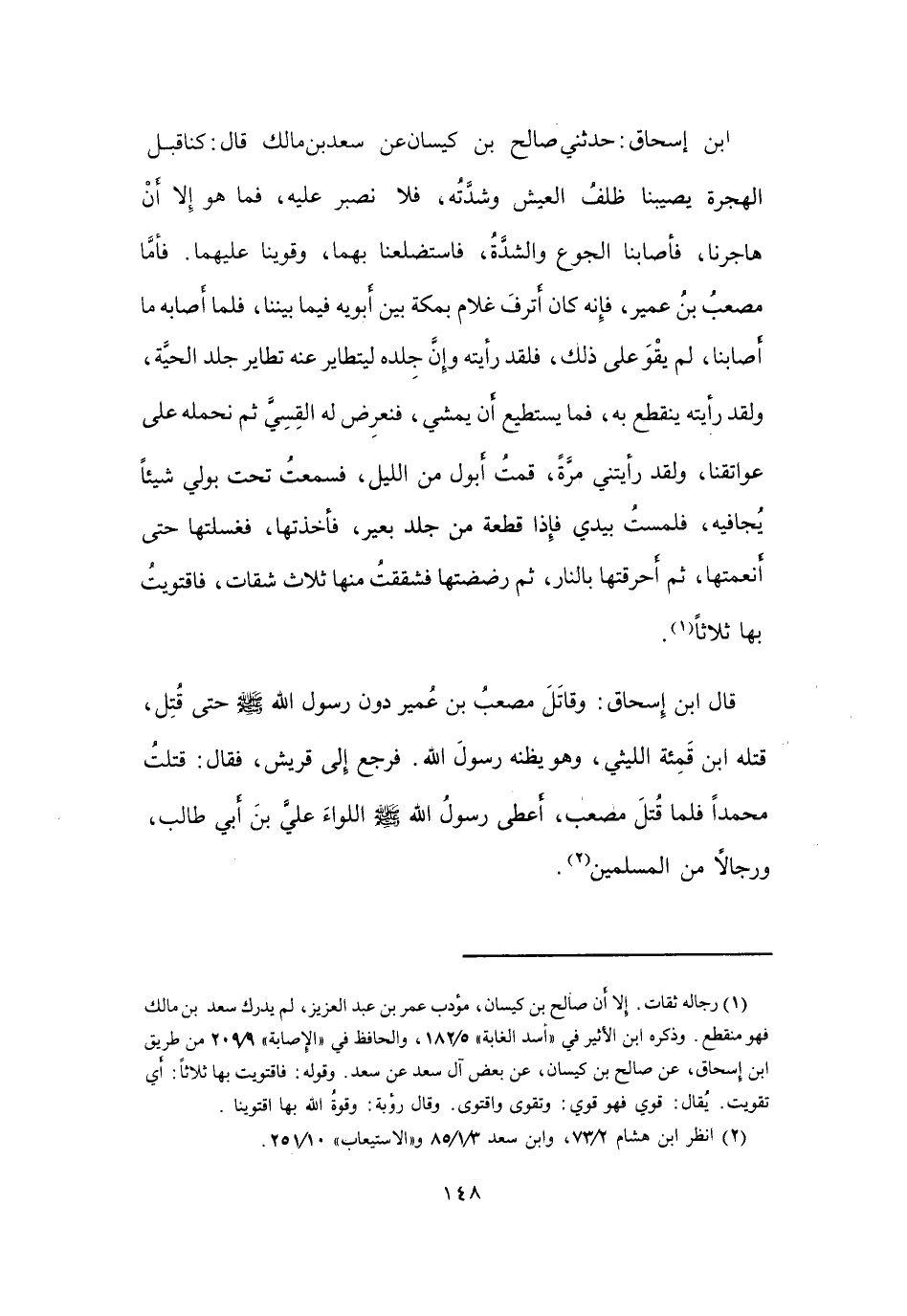 قَالَ ابْنُ إِسْحَاقَ: وَقَاتَلَ مُصْعَبُ بنُ عُمَيْرٍ دُوْنَ رَسُوْلِ اللهِ -صَلَّى اللَّهُ عَلَيْهِ وَسَلَّمَ- حَتَّى قُتِلَ.