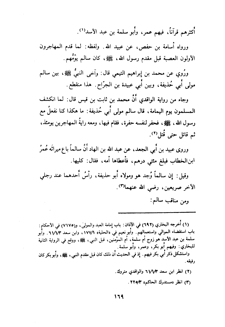 لَمَّا قَدِمَ المُهَاجِرُوْنَ الأَوَّلُوْنَ العُصْبَةَ قَبْلَ مَقْدَمِ رَسُوْلِ اللهِ -صَلَّى اللَّهُ عَلَيْهِ وَسَلَّمَ- كَانَ سَالِمٌ يَؤُمُّهُم.