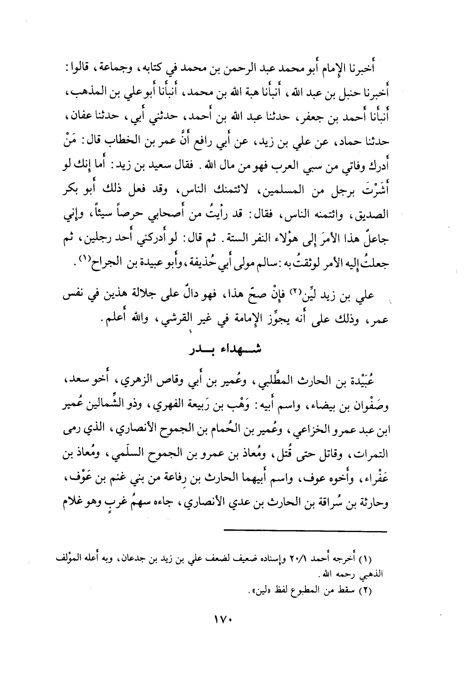 عَلِيُّ بنُ زَيْدٍ: لَيِّنٌ (2) ، فَإِنْ صَحَّ هَذَا، فَهُوَ دَالٌّ عَلَى جَلاَلَةِ هَذَيْنِ فِي نَفْسِ عُمَرَ، وَذَلِكَ عَلَى أَنَّهُ يُجَوِّزُ الإِمَامَةَ فِي غَيْرِ القُرَشِيِّ، وَاللهُ أَعْلَمُ.