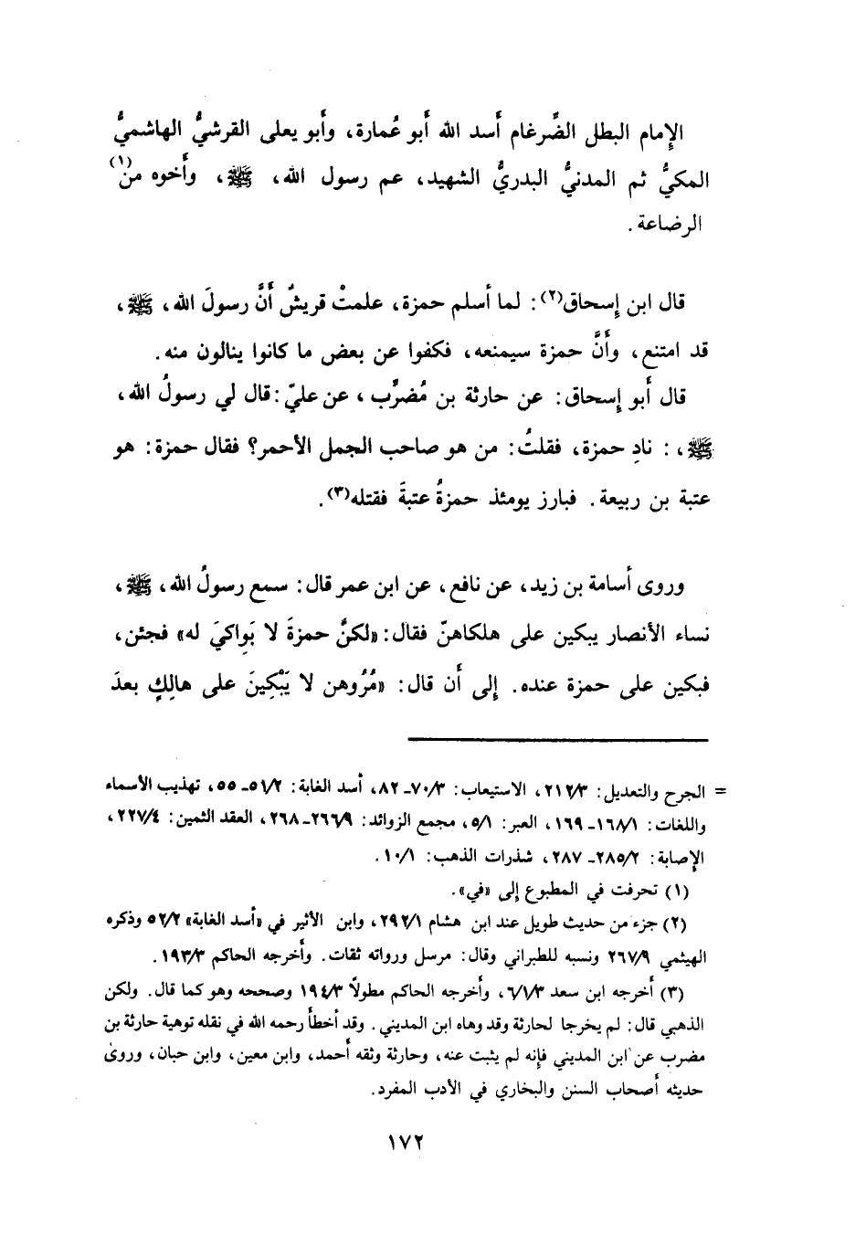 الإِمَامُ، البَطَلُ، الضِّرْغَامُ، أَسَدُ اللهِ، أَبُو عُمَارَةَ، وَأَبُو يَعْلَى القُرَشِيُّ، الهَاشِمِيُّ، المَكِّيُّ، ثُمَّ المَدَنِيُّ، البَدْرِيُّ، الشَّهِيْدُ.