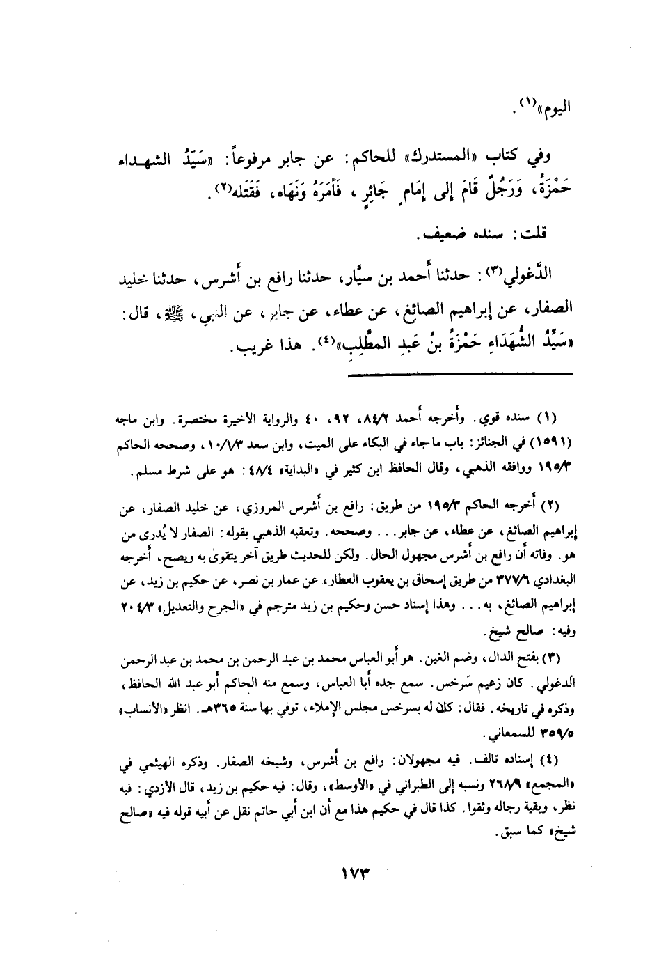 عَنْ جَابِرٍ مَرْفُوْعاً: (سَيِّدُ الشُّهَدَاءِ: حَمْزَةُ، وَرَجُلٌ قَامَ إِلَى إِمَامٍ جَائِرٍ، فَأَمَرَهُ، وَنَهَاهُ، فَقَتَلَهُ) (2) .