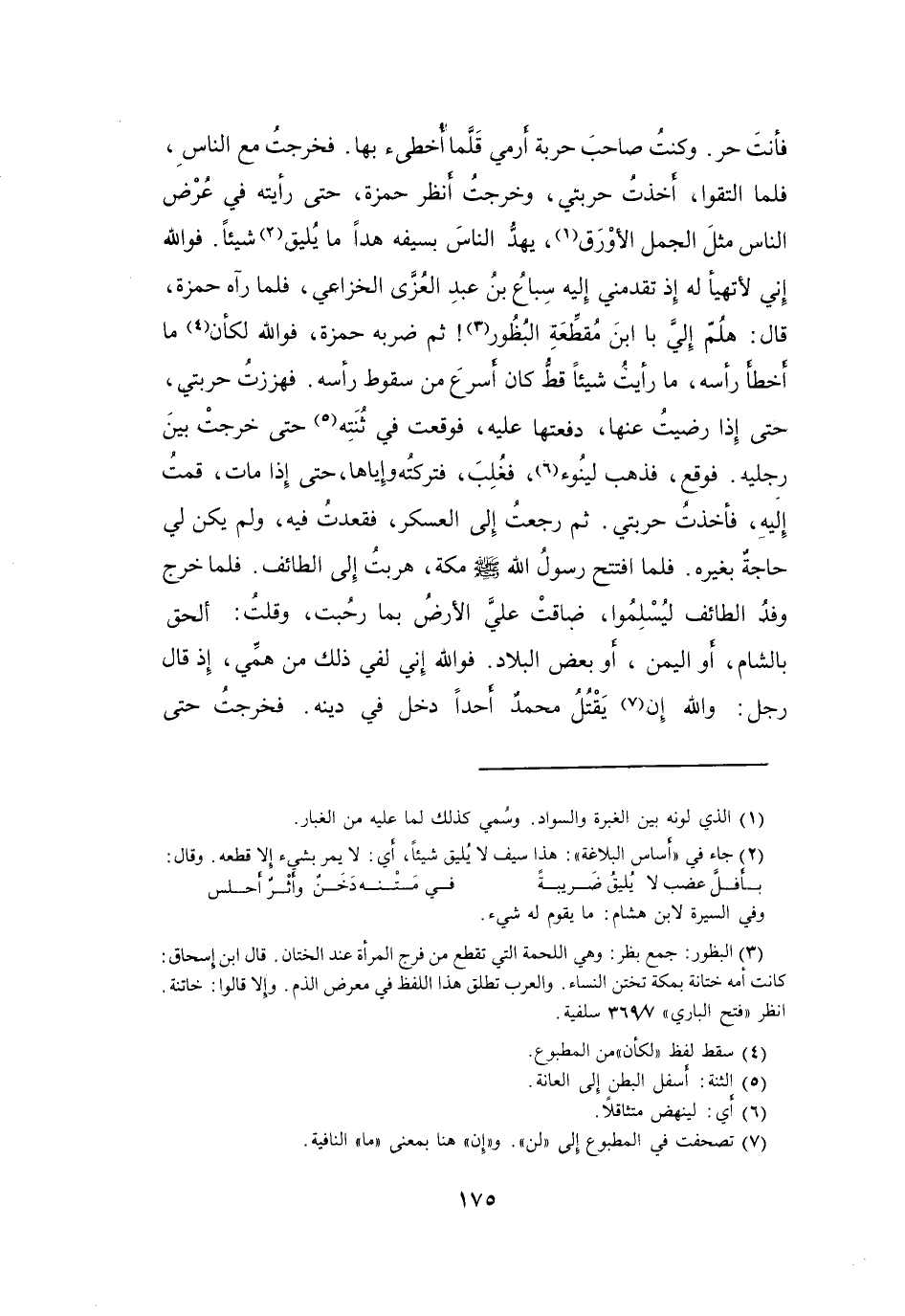 وَكُنْتُ صَاحِبَ حَرْبَةٍ أَرْمِي، قَلَّمَا أُخْطِئُ بِهَا، فَخَرَجْتُ مَعَ النَّاسِ، فَلَمَّا الْتَقَوْا أَخَذْتُ حَرْبَتِي، وَخَرَجْتُ أَنْظُرُ حَمْزَةَ، حَتَّى رَأَيْتُهُ فِي عُرْضِ النَّاسِ مِثْلَ الجَمَلِ الأَوْرَقِ (1) ، يَهُدُّ النَّاسَ بِسَيْفِهِ هَدّاً مَا يُلِيْقُ (2) شَيْئاً، فَوَاللهِ إِنِّي لأَتَهَيَّأُ لَهُ إِذْ تَقَدَّمَنِي إِلَيْهِ سِبَاعُ بنُ عَبْدِ العُزَّى الخُزَاعِيُّ.