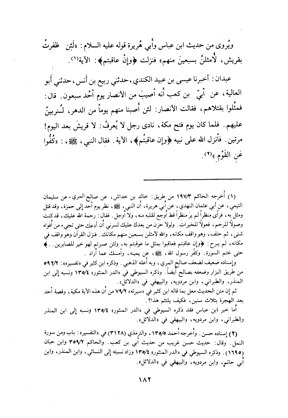 وَيُرْوَى مِنْ حَدِيْثِ ابْنِ عَبَّاسٍ، وَأَبِي هُرَيْرَةَ قَوْلُهُ -عَلَيْهِ السَّلاَمُ-: (لَئِنْ ظَفِرْتُ بِقُرَيْشٍ لأُمَثِّلَنَّ بِسَبْعِيْنَ مِنْهُم) .
