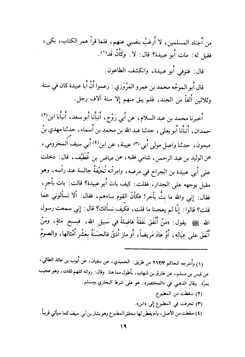 دَخَلْتُ عَلَى أَبِي عُبَيْدَةَ بنِ الجَرَّاحِ فِي مَرَضِهِ، وَامْرَأَتُهُ تُحَيْفَةُ جَالِسَةٌ عِنْدَ رَأْسِهِ، وَهُوَ مُقْبِلٌ بِوَجْهِهِ عَلَى الجِدَارِ، فَقُلْتُ: كَيْفَ بَاتَ أَبُو عُبَيْدَةَ؟