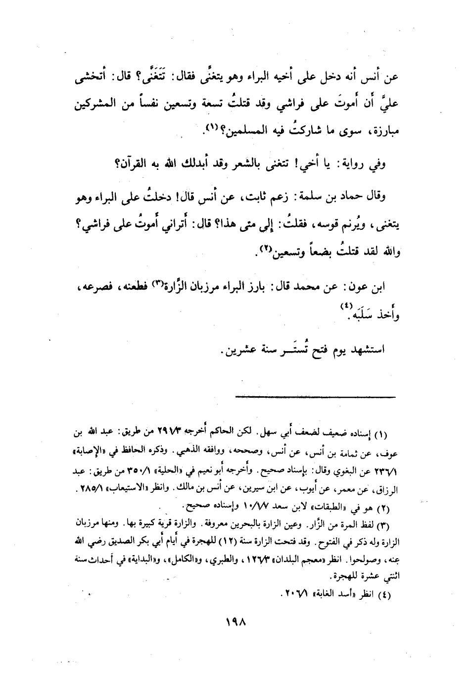بَارَزَ البَرَاءُ مرزبَانَ الزَّارَةِ (3) فَطَعَنَهُ، فَصَرَعَهُ، وَأَخَذَ سَلَبَهُ (4) .