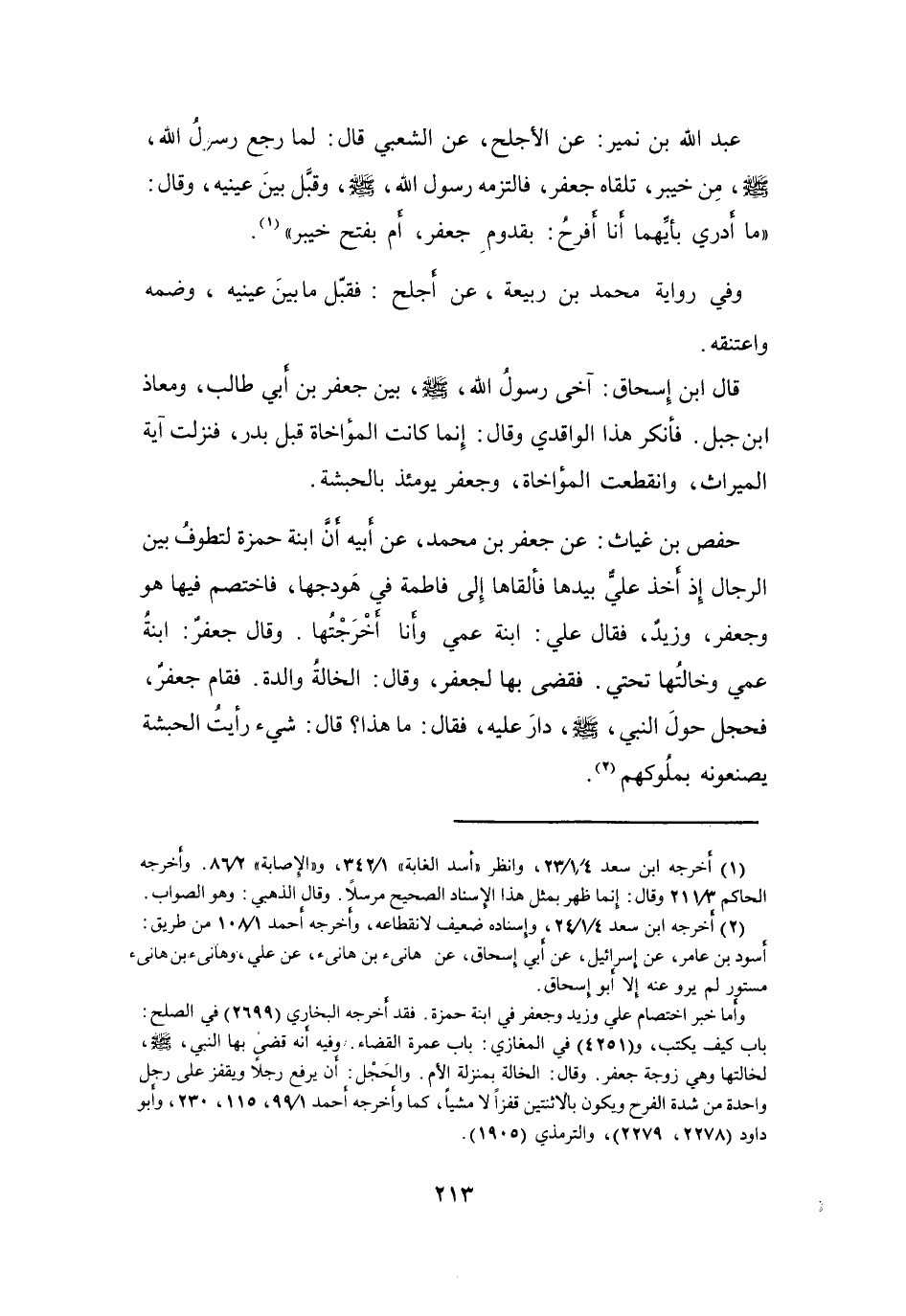 لَمَّا رَجَعَ رَسُوْلُ اللهِ -صَلَّى اللَّهُ عَلَيْهِ وَسَلَّمَ- مِنْ خَيْبَرَ تَلَقَّاهُ جَعْفَرٌ، فَالْتَزَمَهُ رَسُوْلُ اللهِ -صَلَّى اللَّهُ عَلَيْهِ وَسَلَّمَ- وَقَبَّلَ بَيْنَ عَيْنَيْهِ، وَقَالَ: (مَا أَدْرِي بِأَيِّهِمَا أَنَا أَفْرَحُ: بِقُدُوْمِ جَعْفَرٍ، أَمْ بِفَتْحِ خَيْبَرَ (1)) .