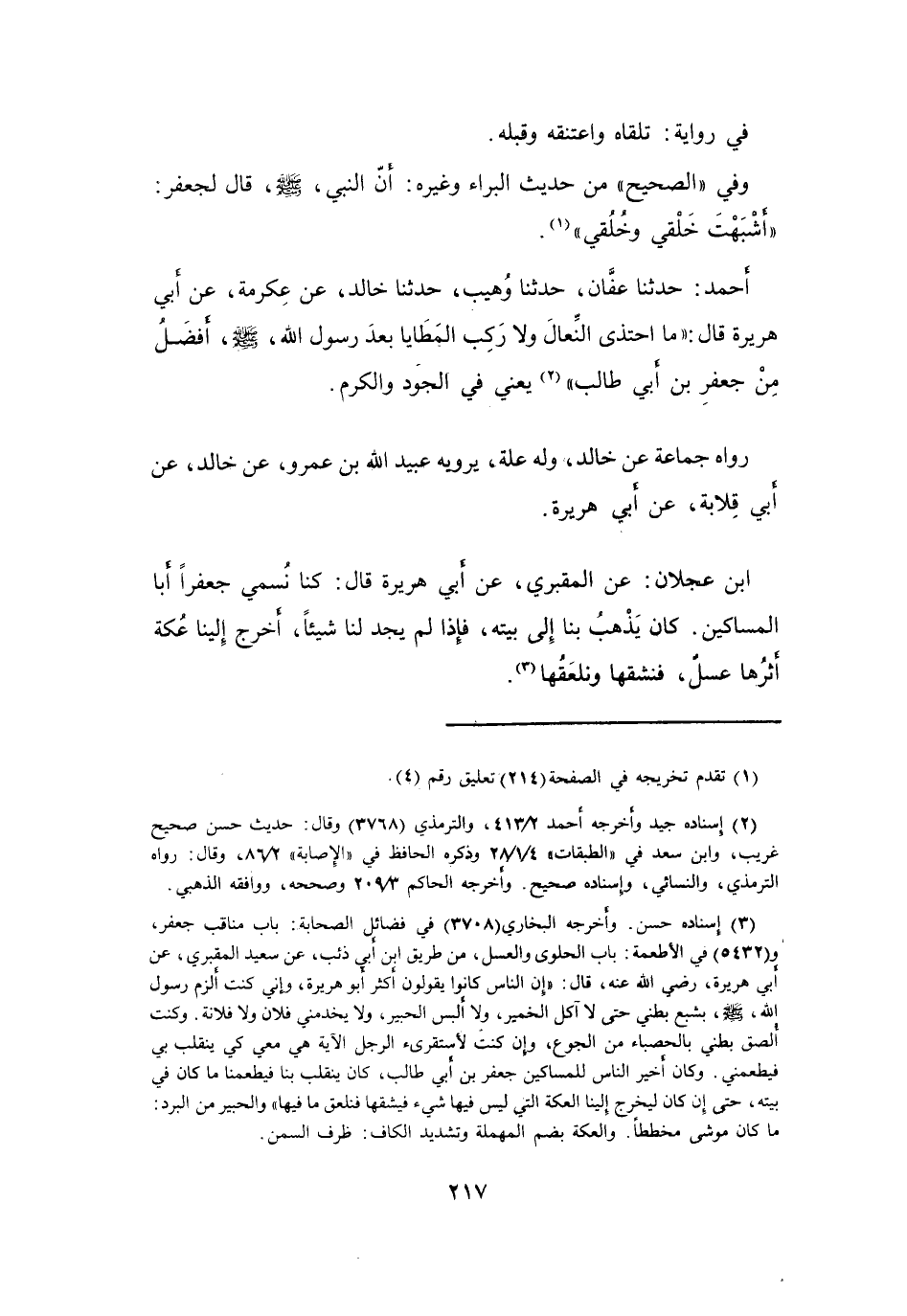 كُنَّا نُسَمِّي جَعْفَراً أَبَا المَسَاكِيْنِ، كَانَ يَذْهَبُ بِنَا إِلَى بَيْتِهِ، فَإِذَا لَمْ يَجِدْ لَنَا شَيْئاً، أَخْرَجَ إِلَيْنَا عُكَّةً أَثَرُهَا عَسَلٌ، فَنشُقُّهَا، وَنَلْعَقُهَا (3) .