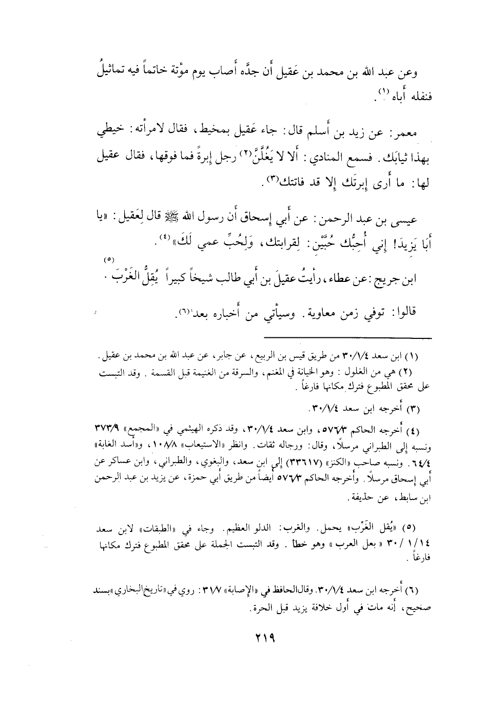(1) ابن سعد 4 / 1 / 30 من طريق قيس بن الربيع، عن جابر، عن عبد الله بن محمد بن عقيل.